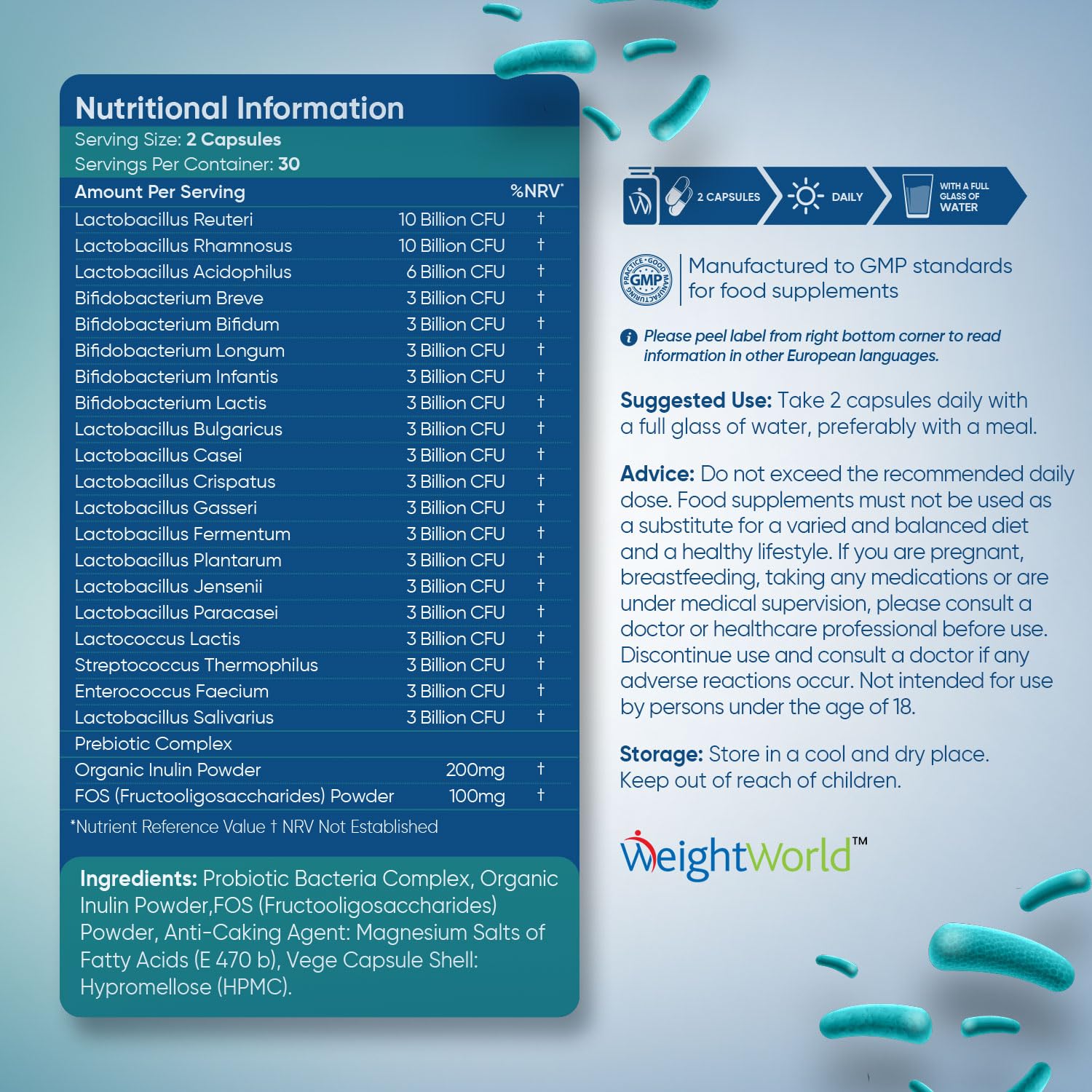 - DELAYED-RELEASE CAPSULES FOR ENHANCED ABSORPTION: WeightWorld's prebiotics and probiotics for women & men come in delayed-release capsules that help protect the live organisms in the capsules from stomach acid for longer. This ensures maximum efficacy to support your general well-being. Each bio cultures complex probiotics bottle contains 60 capsules to keep you replenished for a whole month. Plus, our probiotic complex bottle does not require refrigeration, which makes it travel-friendly too.