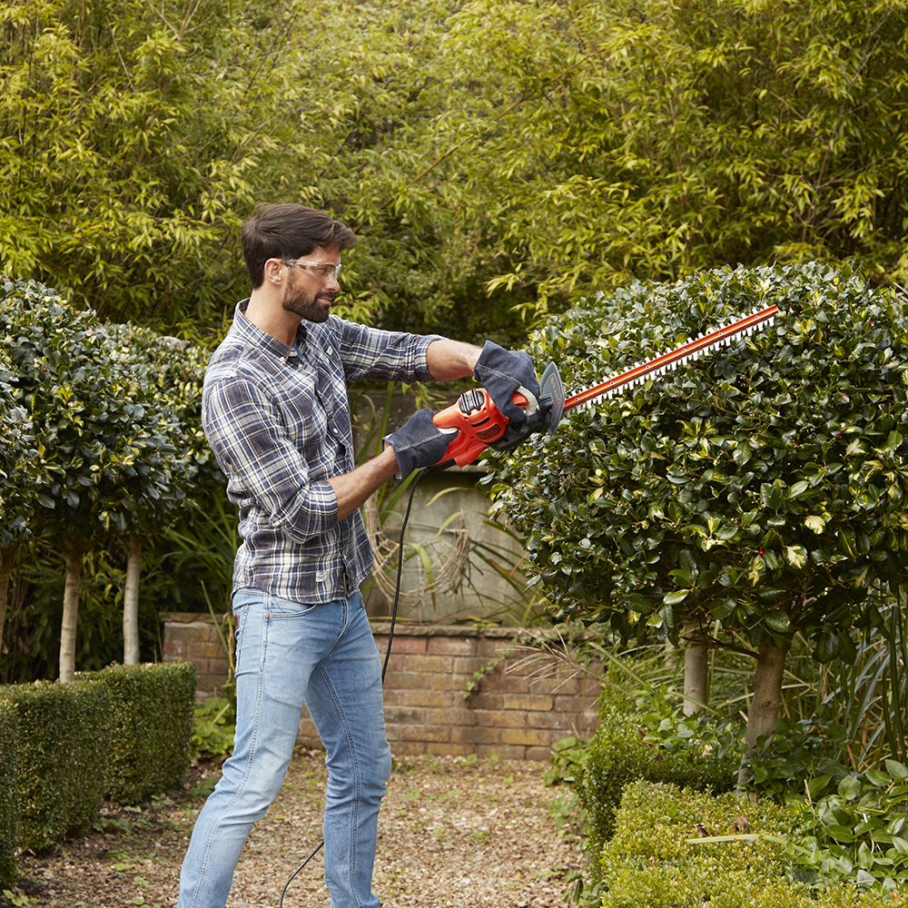 Details: The BLACK+DECKER 45cm 420W Hedge Trimmer has been designed to be lightweight and compact. The powerful 420W motor with 45cm dual action steel blades can cut through hedges easily and quickly. The trimmer is ideal for cutting small to medium hedges, having a maximum cut capacity of up to 16mm. The bale handle design gives optimum comfort and control while minimising the load on arms, shoulders and back.