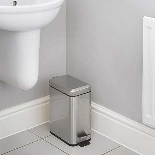 - Metallic grey slimline, rectangular profile pedal bin design for easy placement in smaller spaces
