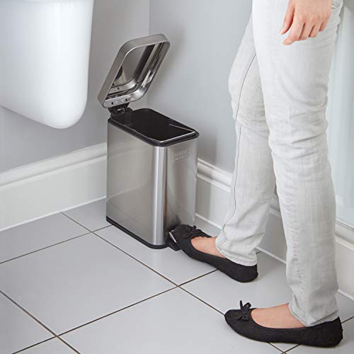 Details: BLACK+DECKER's 5L rectangular profile pedal bin is compact and practical, make disposing of waste simple. The bin features a soft-close lid, so that once your foot is removed from the pedal the lid will gently close. The pedal bin is metallic grey in colour, features a fingerprint proof design, and is crafted from stainless steel. The removable inner bucket with carry handle ensures it is easy to empty contents straight into the outside bin. SPECIFICATIONS - 5L capacity, Soft close lid, Fingerprint proof, Removable inner bucket with carry handle, Material - Stainless Steel, Grey Colour, Dimensions - 30cm High x 14cm Wide x 29cm Deep.