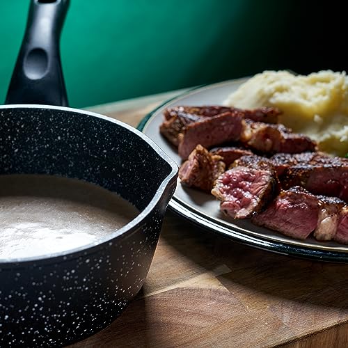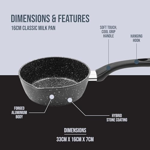 - NON-STICK COATING – The milk pan features a non-stick coating that will ensure an efficient release of the milk or sauces from the pan at all times. The pan also features a forged aluminium base, and a hybrid stone coating that allows heat to conduct faster, and retains said heat for longer when in use.
