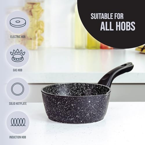 - SUITABLE FOR ALL HOB TYPES – This milk pot is suitable to be used on all hob types such as gas, electric, induction, and even on hot plates too. The pan comes in a stylish black marble effect colour, ensuring it looks the part in any style of kitchen.