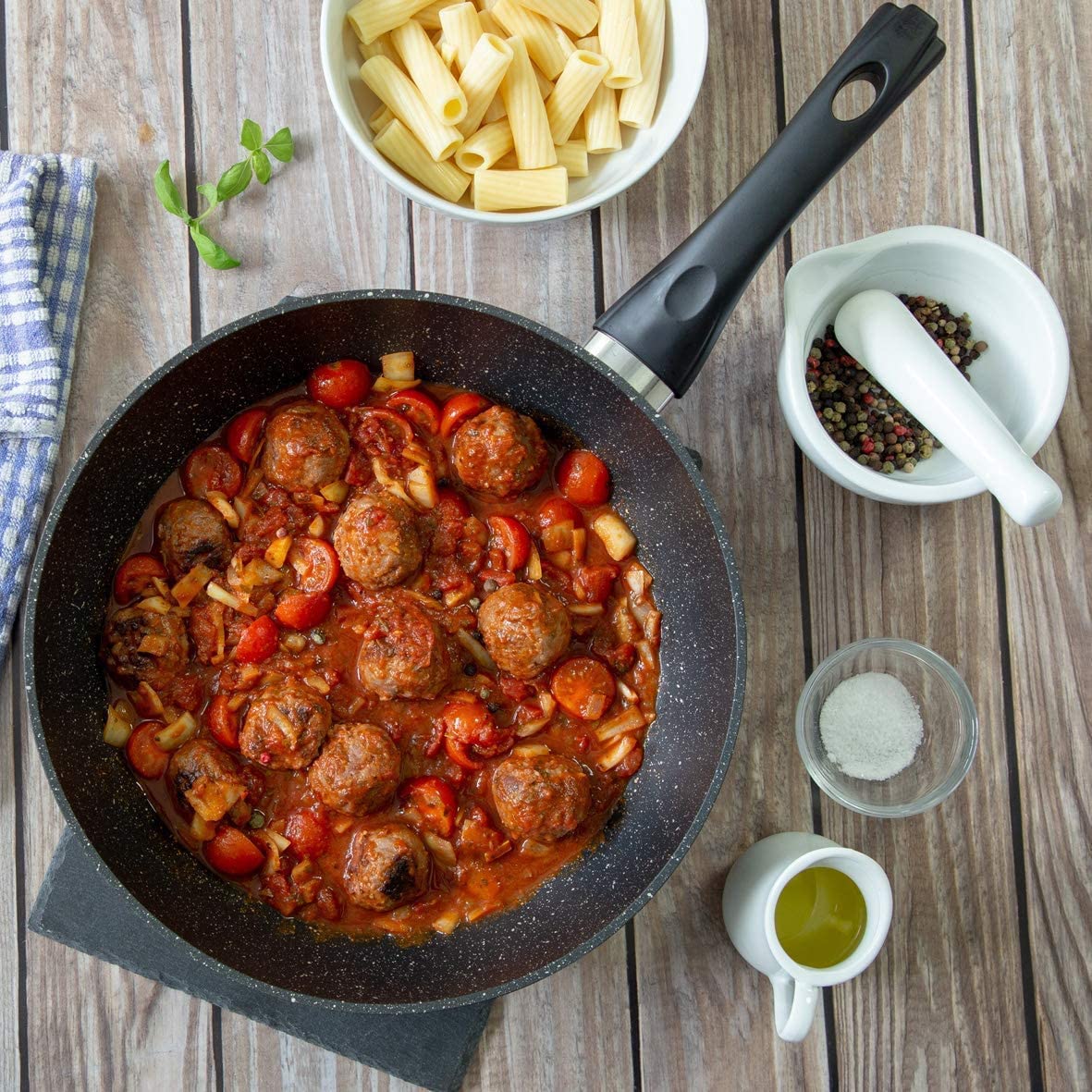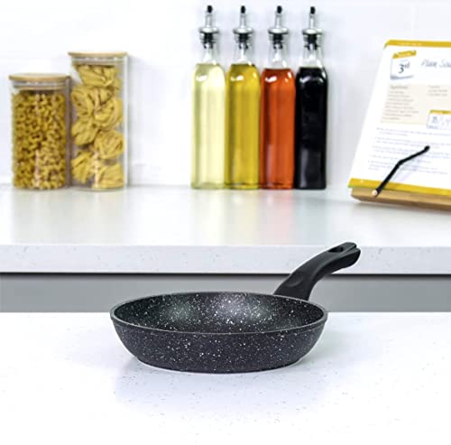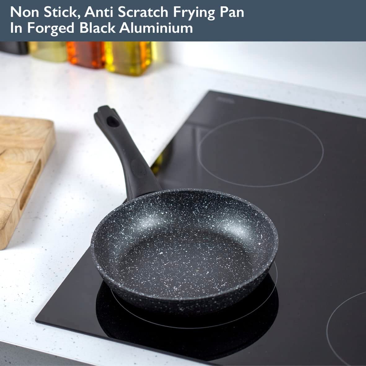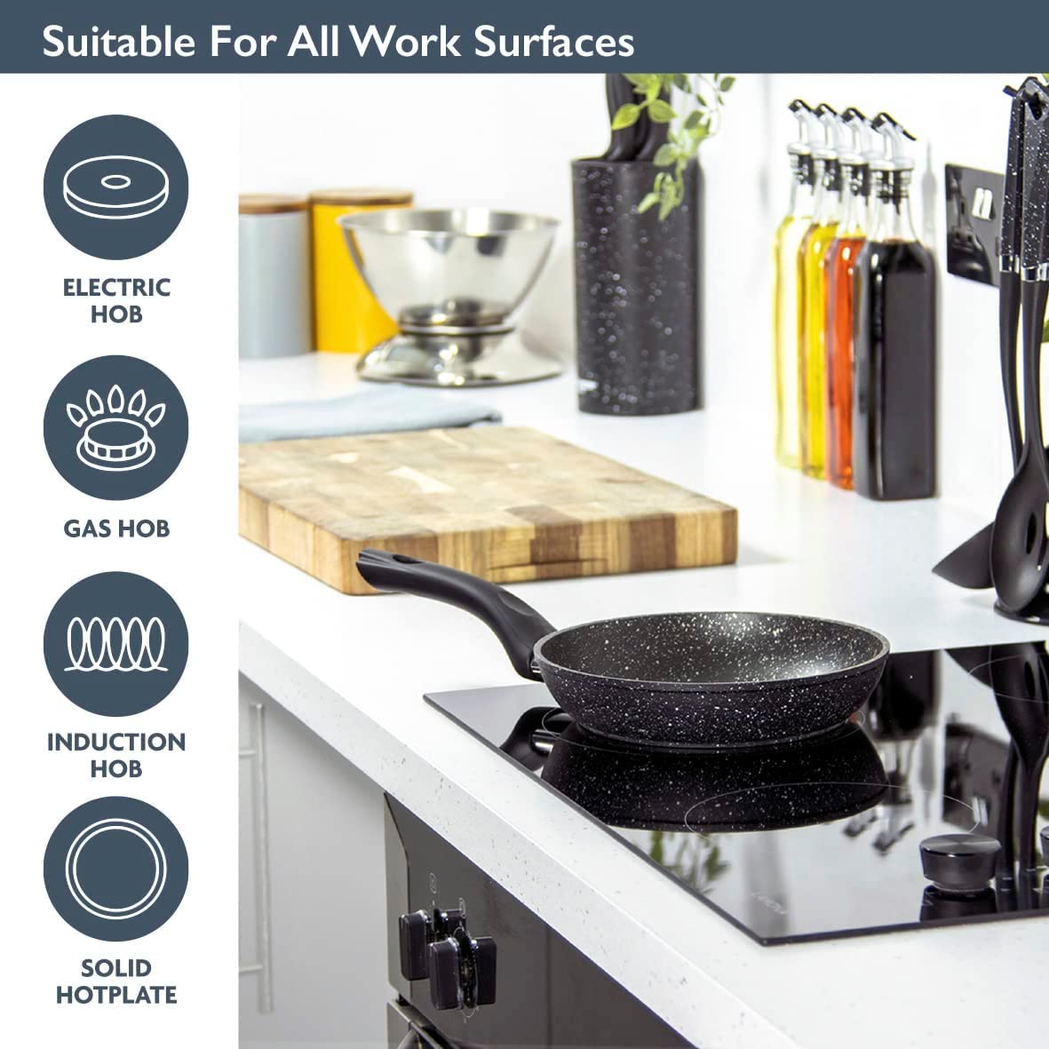 - SUITABLE FOR ALL HOB TYPES – This frying pan is suitable to be used on all hob types such as gas, electric, induction, and even on hot plates too. The pan comes in a stylish black marble effect colour, ensuring it looks the part in any style of kitchen.