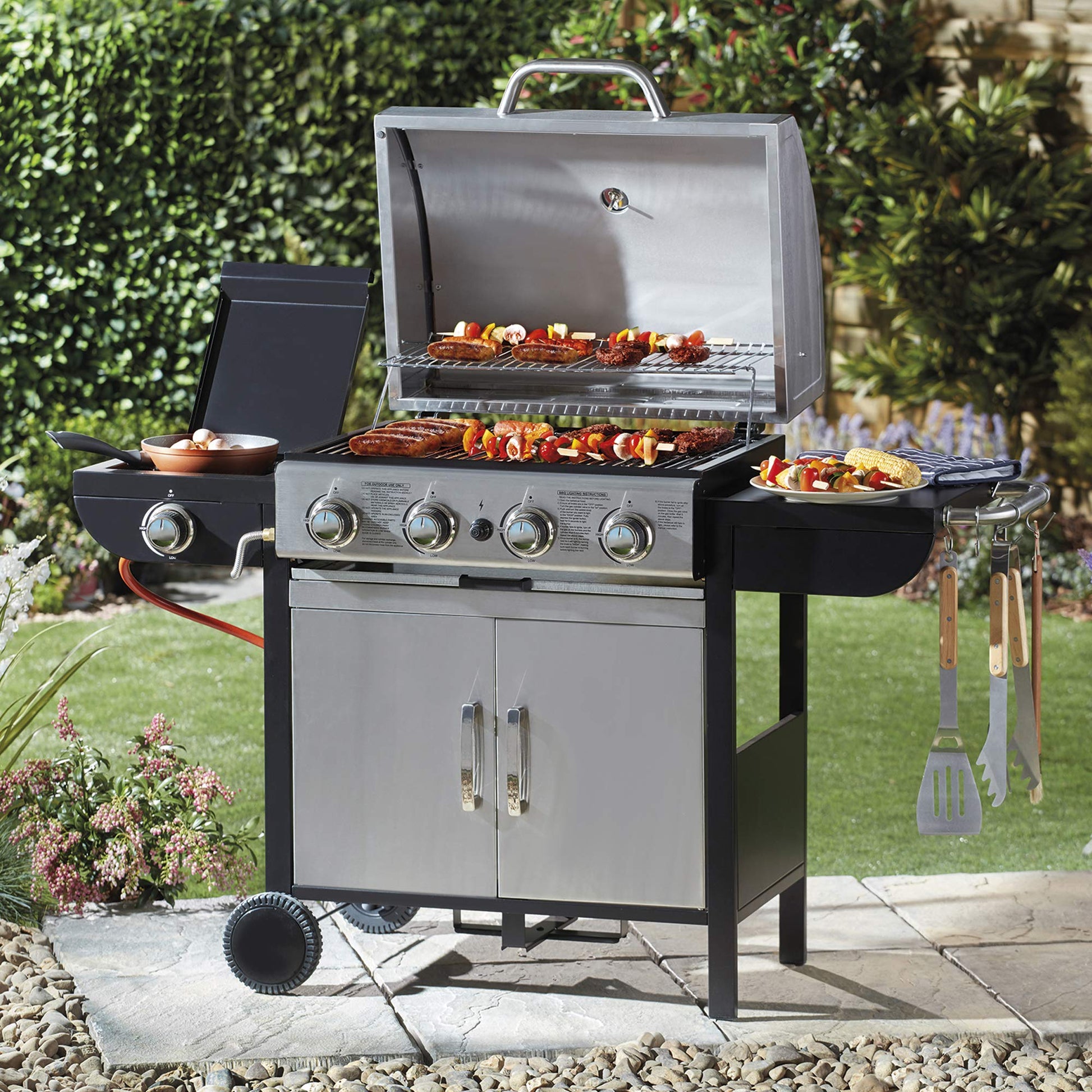 This gas bbq gives you complete control of the temperature, so you can cook your food in the best way possible. By simply turning the four individual temperature dials, you can control the temperature of each burner. Another brilliant feature is the side burner, this has the option of either being a side table or simply lift the flap and use it as an extra burner for saucepans and griddles. It also has an integrated thermometer so, when the lid is closed, you can keep a close eye on the temperature inside without opening the lid and losing all the heat.