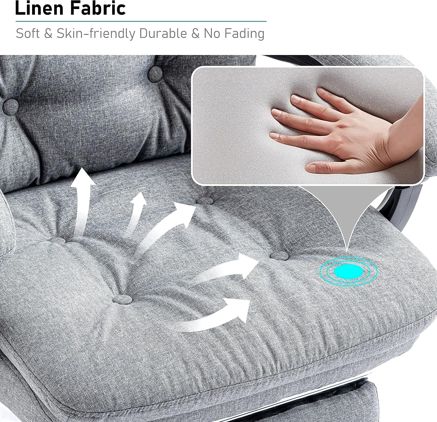 Material : Linen Fabric, Colour : Linen Grey, SGS- 4 Certification Gas Lift Frame Material : Stainless Steel Recline Function : 90°-135° Rotation : 360° Rotation Product Size (W x D x H): 69 x 67 x (110-120) cm. Seat Height : 47-57 cm. Seat Width : 55cm Seat Depth : 45cm Backrest Height : 74cm Backrest Width : 55cm Armrest Height From Floor : 66-76 cm Recommended Max User Weight: 120kg Adjustment: Armrests, Seat Height, Seat Tilt, Tension Control Fetures : Casters/Wheels, Chair Gas Lift, Ergonomic, Heavy Duty, High Back, Lumbar Support, Padded Arms, Padded Seat, Swivel, Tilt Control, Tilt Lock Room : Home Office, Living room, Bedroom Assembly Required : Yes PACKAGE INCLUDE