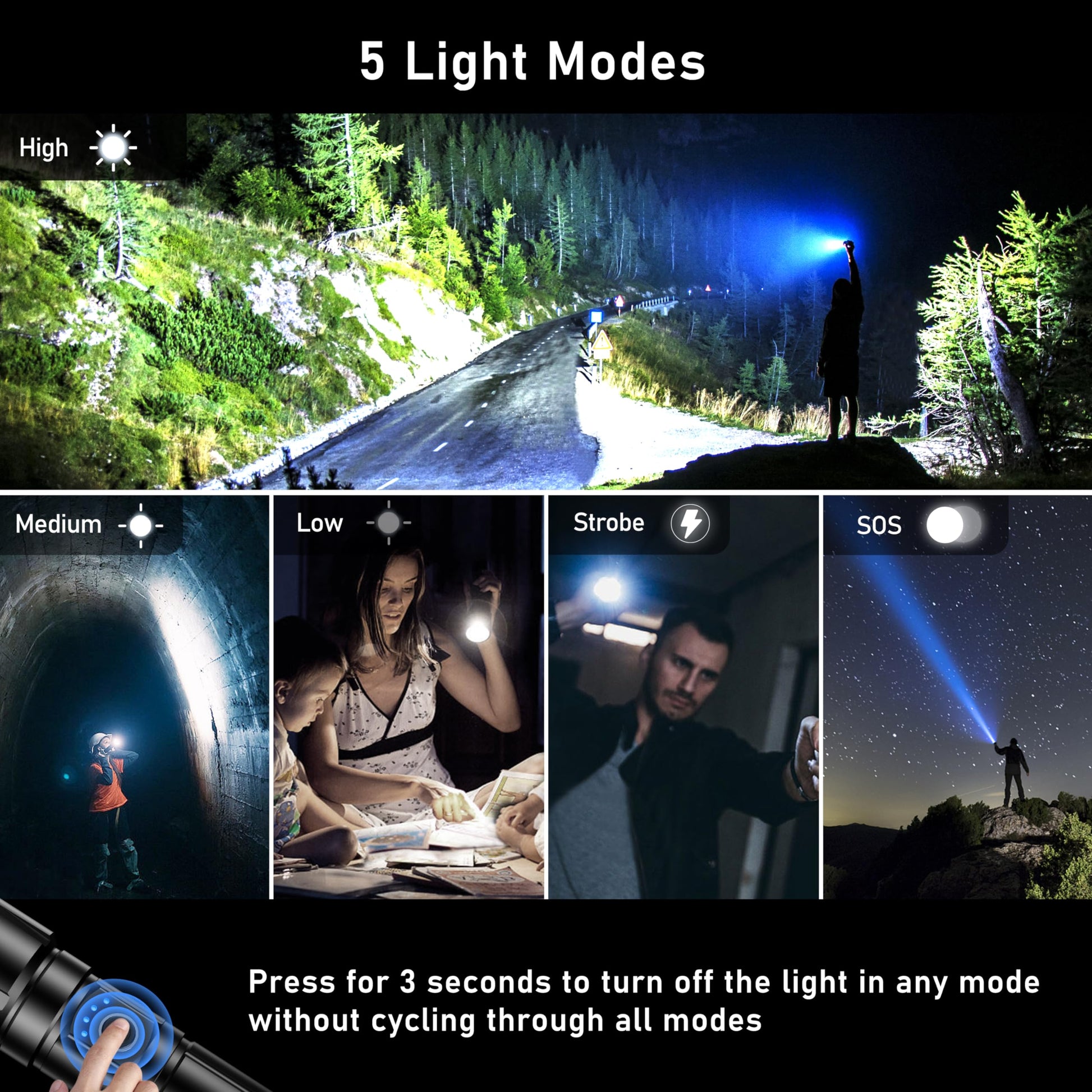 - š¦ć5 Lighting Modes & Zoomableć5 One-button control modes: High-Medium-Low-Strobe-SOS. Press for 3 seconds to turn off the light in any mode without cycling through all modes. The zoomable design allows you to adjust the focal length. By retracting the flashlight head, you can freely choose long-distance spotlight or short-distance large lighting area.