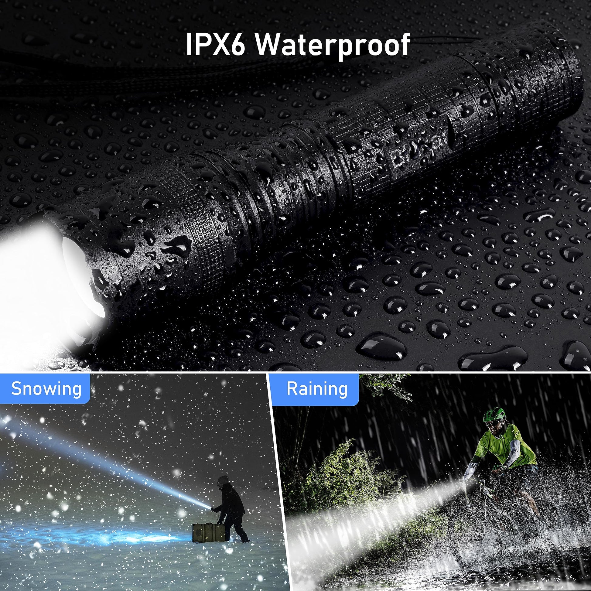 - š¦ćDurable and WaterproofćMade of high quality aluminium alloy, the torch housing has good hardness, wear resistance and drop resistance. Thanks to IPX6 waterproof design, this torch can well adapt to extreme weather conditions, ideal for outdoor use.