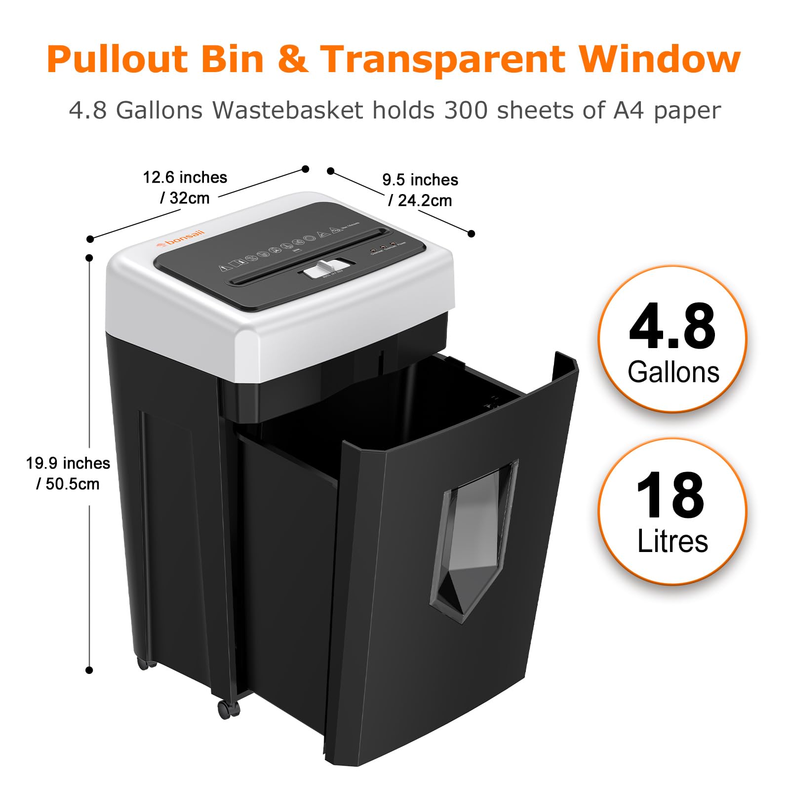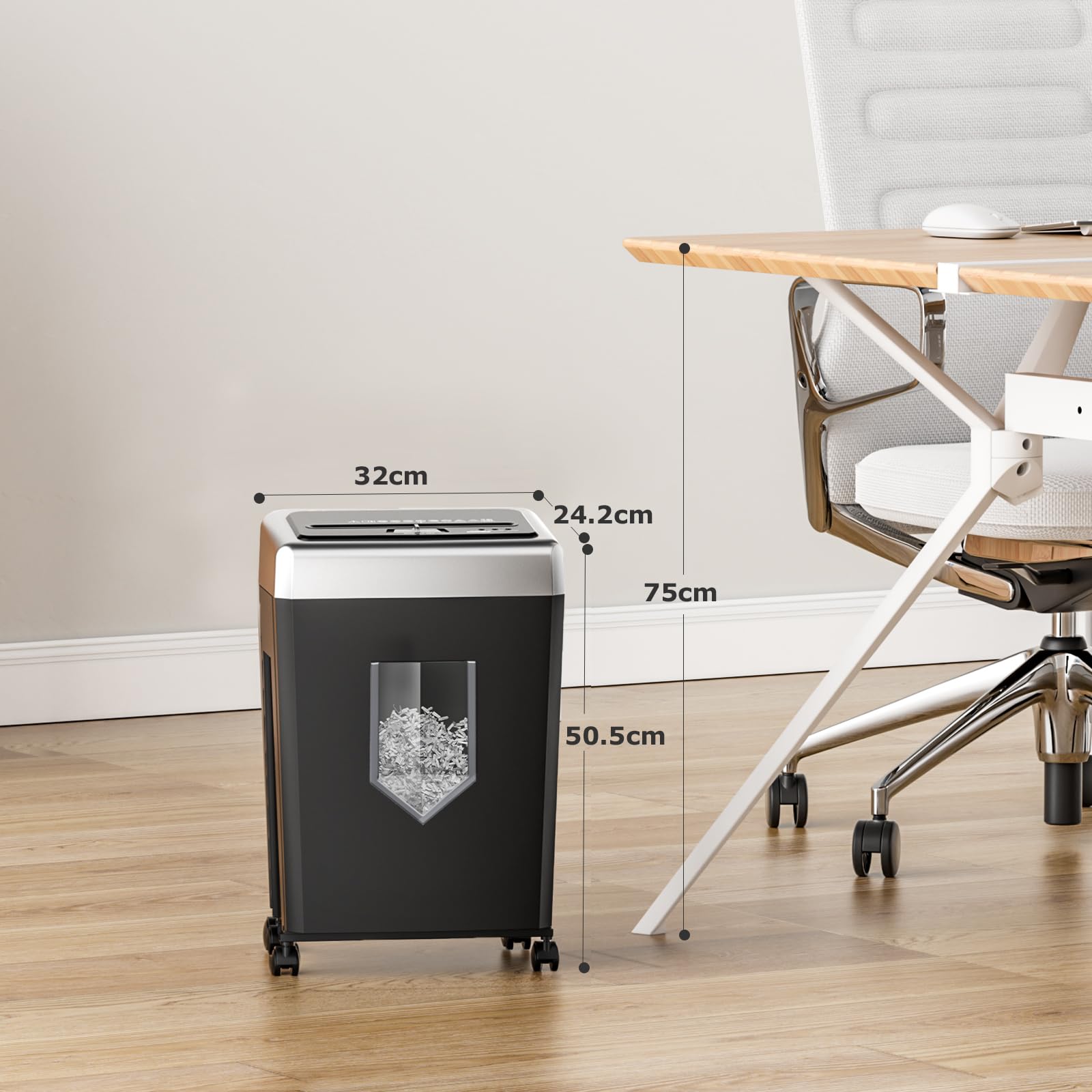 - [Low Noise, Ideal for Office Use] Operating at 60dB, this shredder is quieter than most, minimizing disruption in the workplace. Its wheels make it easy to move around, making it perfect for office environments where quiet operation is essential