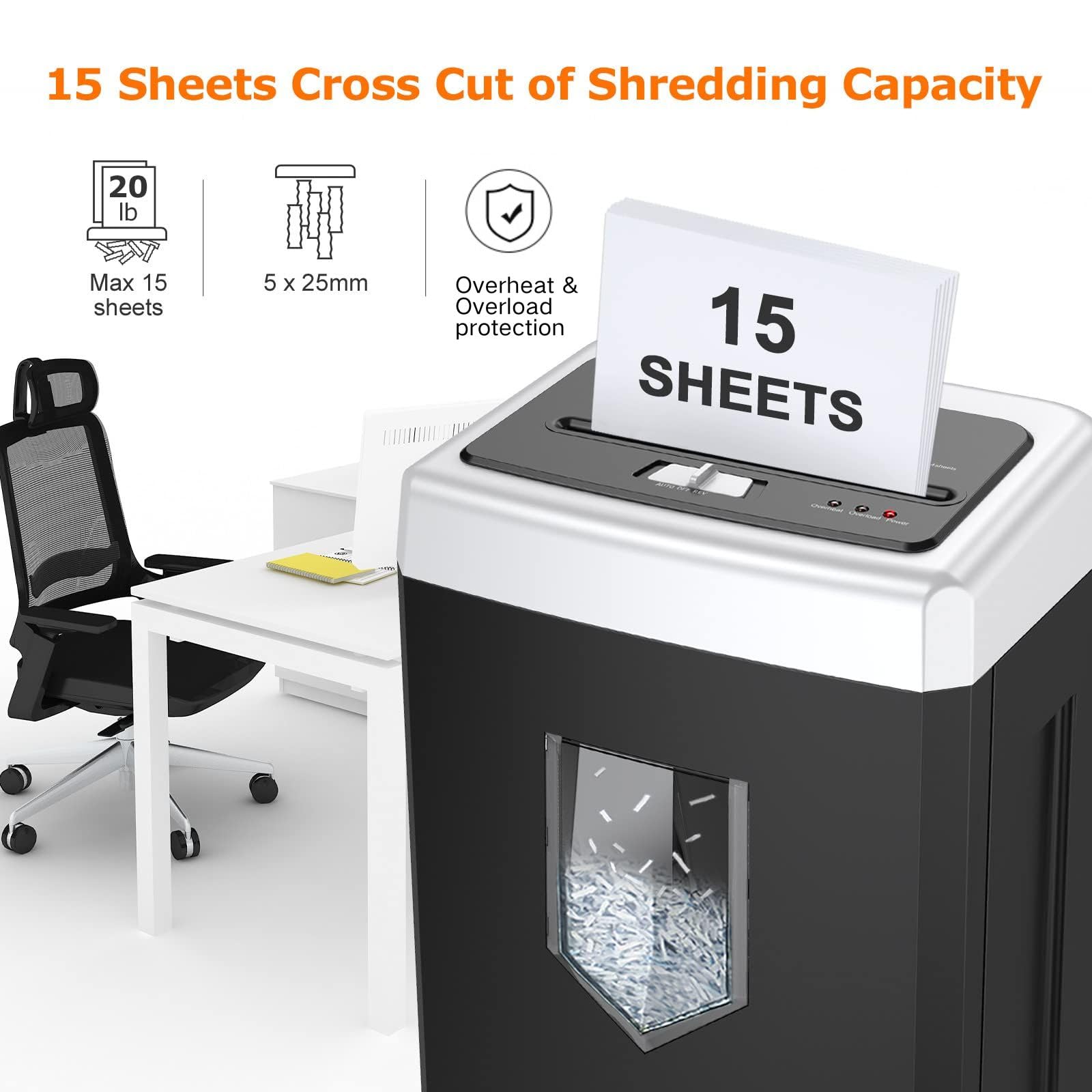 - [Keep Personal Information Secure] This cross cut shredder handles up to 15 sheets (A4 size 80g) per pass and can shred CDs, credit cards (one at a time, but not suitable for metal credit cards), staples, and paperclips into tiny cross cut particles measuring 5 x 25mm