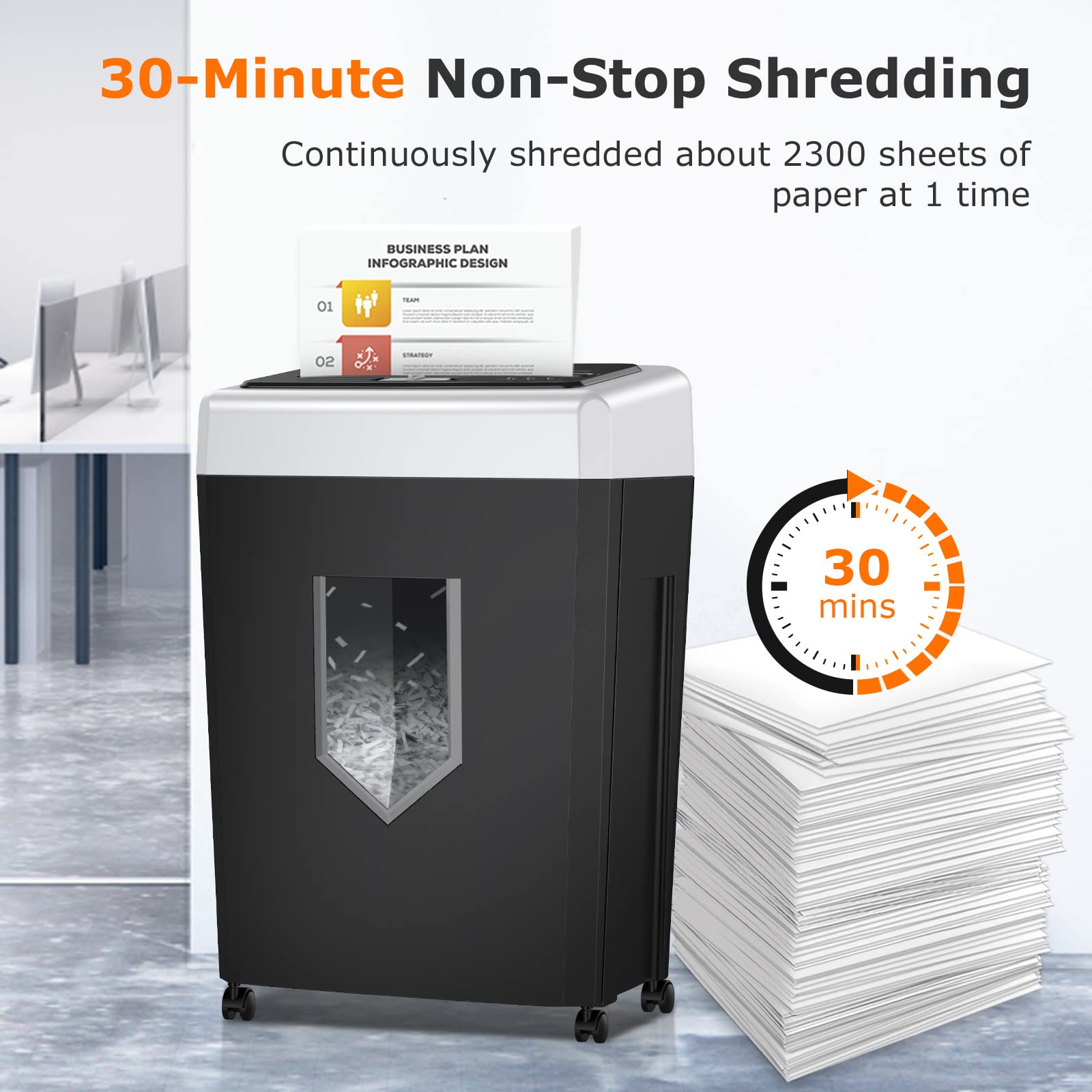 - [30 Minutes Long Working Time] Featuring an advanced cooling system and patented shredding technology, this shredder operates continuously for up to 30 minutes and requires only 40 minutes of rest before resuming. It efficiently destroys about 2300 sheets of paper in a 30-minute session