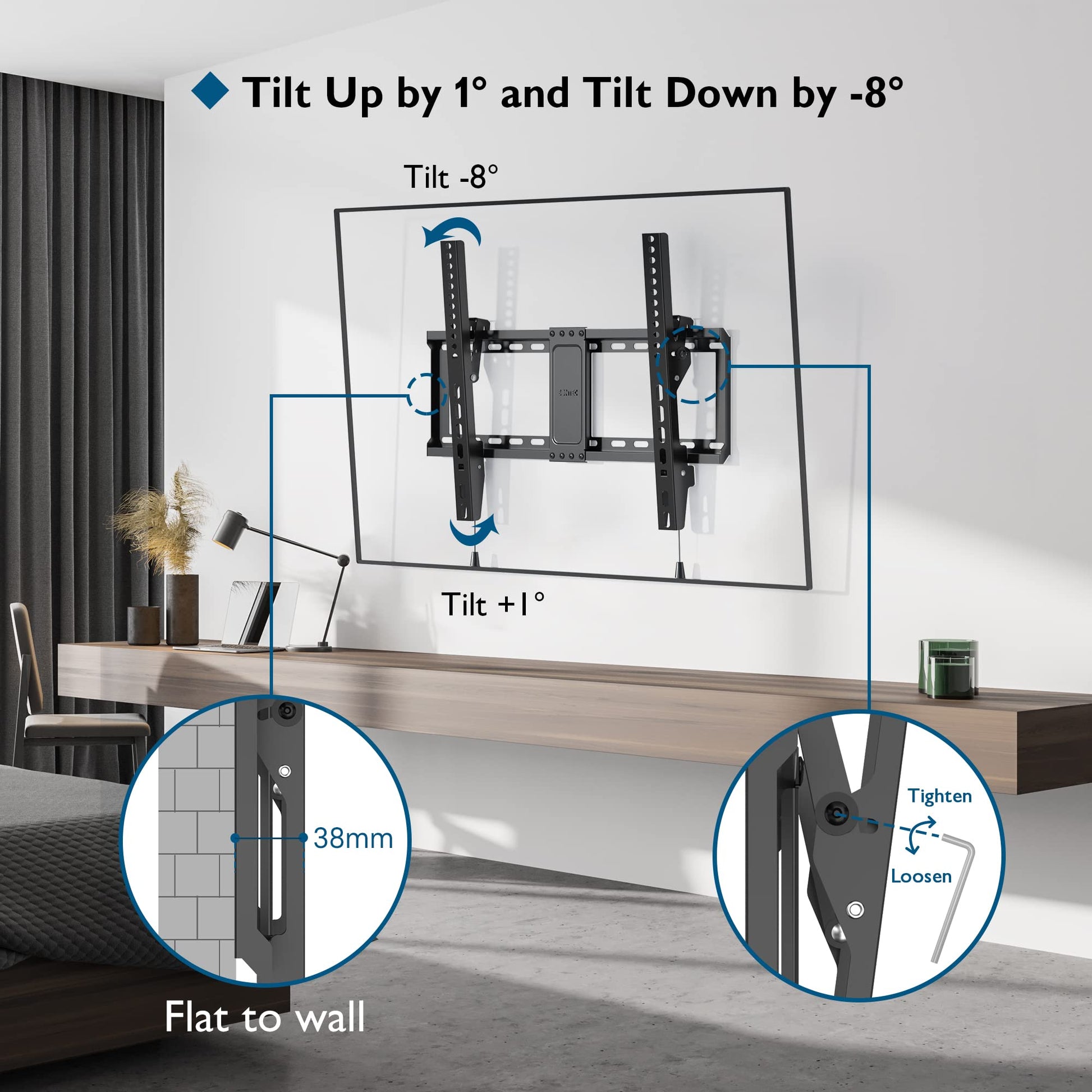 - 【Improve Your Viewing Experience】Our TV Wall Mount comes with a tilt feature that allows you to tilt between 1°and -8°, so you can choose the most comfortable position while reducing glare and neck/eye strain.