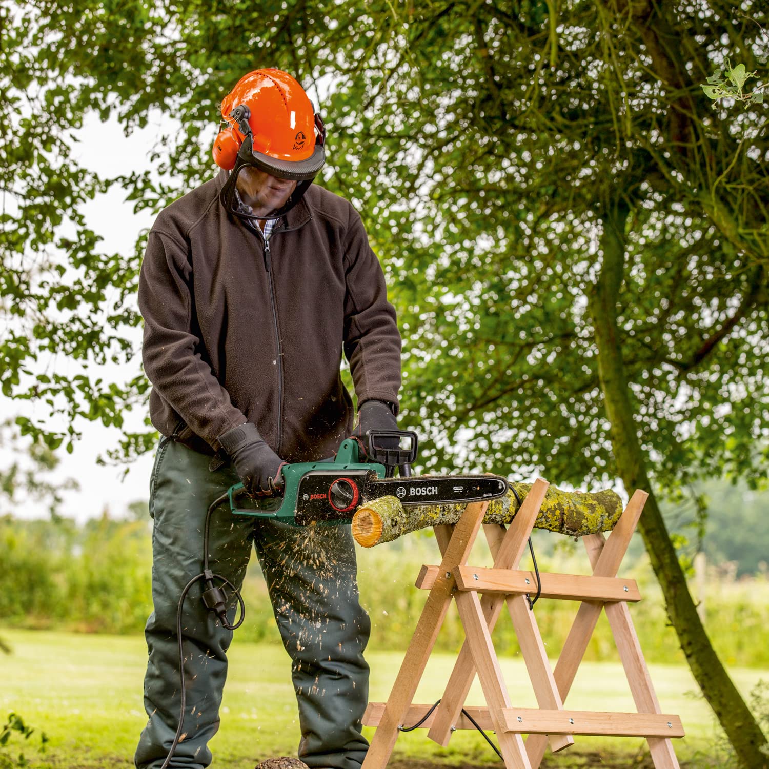 Details: Bosch Chainsaw UniversalChain 35High quality cutting performance:The tool can be used to cut logs, branches and small-to-medium trees thanks to its powerful 1800 W motor and 12 m/s chain speed.Quick assembly and easy cleaning:The chainsaw can be assembled quickly as it features a concentric SDS system. The integrated tensioning wheel affixed to the bar allows simple assembly with two hands for easy tool-free tensioning and maintenance. An ergonomic cover design can be conveniently cleaned and improves the flow of wood chips, reducing blockages and downtime for highly efficient working.Clean, fast and safe maintenance:The large 250ml tank reduces refill frequency of the oil and features a tethered cap for convenience. The oil tank is side-oriented whichenables the user to avoid spillage onto the handle.Lightweight, ergonomic and balanced:UniversalChain 35 is lightweight and balanced, weighing only 4.2 kg. Comfort handles add to reducing user fatigue.Technical details:Motor power: 1800WChain speed: 12m/sChain bar length: 35cmCutting length: 300mmOil tank capacity: 0.25LSound power level: 102 dB(A)Chain type: Oregon low profile 1.1mm (3/8” pitch)Weight: 4.2kgScope of supply:UniversalChain 3535 cm Chainsaw chain (1.1mm)Chain BarChain coverCarton packagingChainsaw oil is not included.Oil required? Yes. Recommended Bosch 1L biodegradable chainsaw oil 2607000181