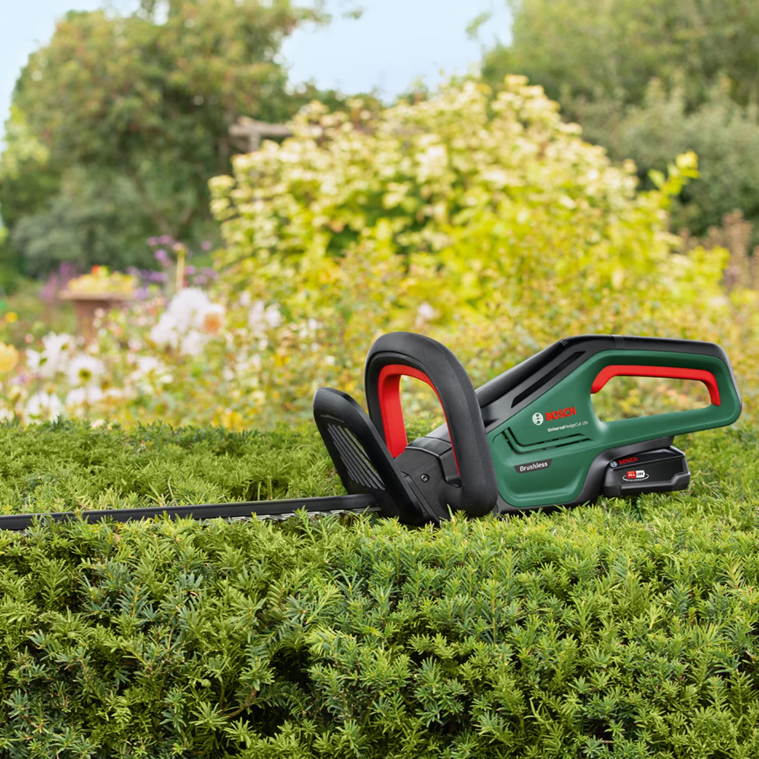 The lightweight cordless hedge trimmer UniversalHedgeCut 18V-50 is ideal for maintaining and cutting medium-sized hedges and bushes. Cordless, well balanced and ergonomically designed, it is easy to control and provides comfortable handling in any working position around the garden.