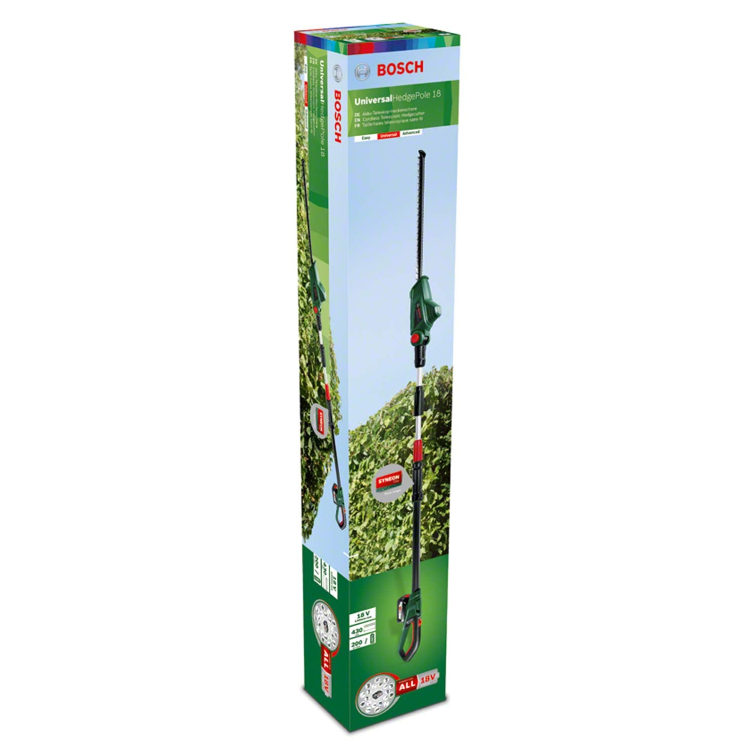 The Bosch UniversalHedgePole 18 cordless hedgecutter is perfect for effortlessly trimming tall hedges. It features a height-adjustable telescopic pole with a pivoting head providing a easy reach of up to 2.6 m making it a ladder-free experience. The Bosch Anti-Blocking system delivers a powerful and continuous cutting performance. It is lightweight (3.6 kg) and optimally balanced for comfortable handling. A powerful 18 V Lithium-ion battery provides up to 2.5 hours of continuous work, without the risk of cutting the power cable. A battery for every tool, Bosch 18 V home and garden batteries can be used for all products in the Bosch home and garden 18 V range.