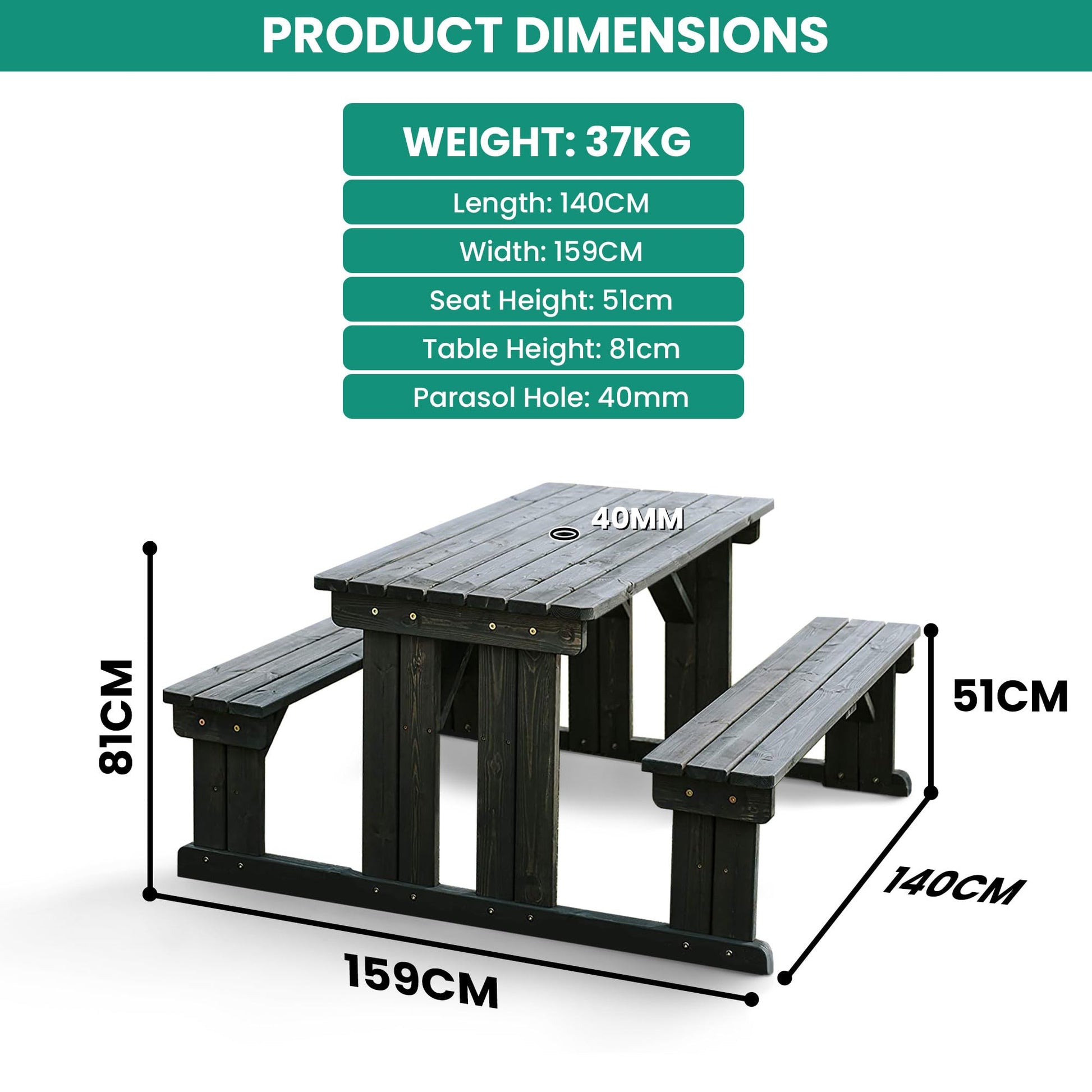 BrackenStyle Guernsey Wooden Picnic Table - Easy Access Walk In Bench - 6 Seater (Dark Grey)