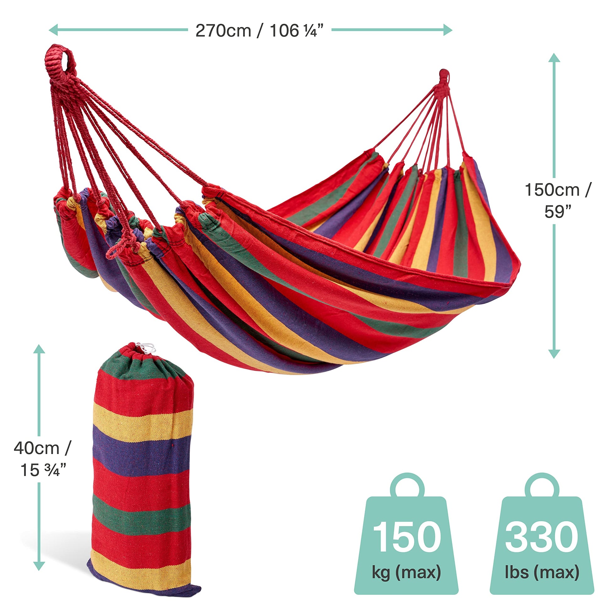 Details: Indulge in blissful relaxation with the Bramble Large Woven Canvas Hammock Garden Swing. Crafted for outdoor summer adventures, this hammock is the perfect retreat for unwinding in nature. Measuring a spacious 270x150cm, it offers ample room to stretch out and find your ideal lounging position. Constructed with high-quality woven canvas, this hammock ensures durability, comfort, and breathability. The sturdy material provides reliable support while allowing for optimal airflow, keeping you cool and comfortable even on warm days. The double hammock comes with a portable travel carry bag, making it effortless to transport and store when not in use. Setting up the double hammock is a breeze, thanks to the included secure ropes. Simply find two sturdy anchor points, attach the ropes, and enjoy a stable and secure swing. With a weight capacity of 150kg, this hammock is built to accommodate users of various sizes. Whether you're camping, enjoying a backyard retreat, or embarking on a beach adventure, the Bramble 2 person hammock garden swing is your ultimate companion. Immerse yourself in tranquility and create unforgettable moments of relaxation. Order now and elevate your outdoor experience!