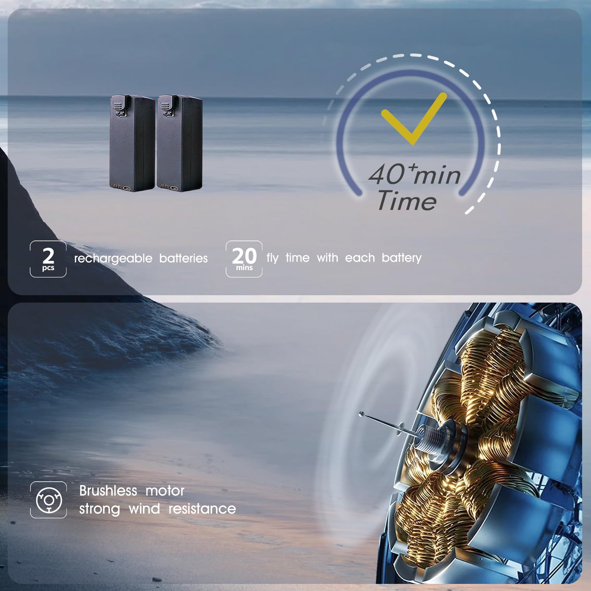 - 【Strong Brushless Motors & Upgraded Batteries】Durable alloy brushless motors feature strong wind resistance, providing faster, quieter, and more powerful flight. Equipped with 2 upgraded batteries, it can provide up to 40 minutes flight time, let your drone traveling in the sky freely.