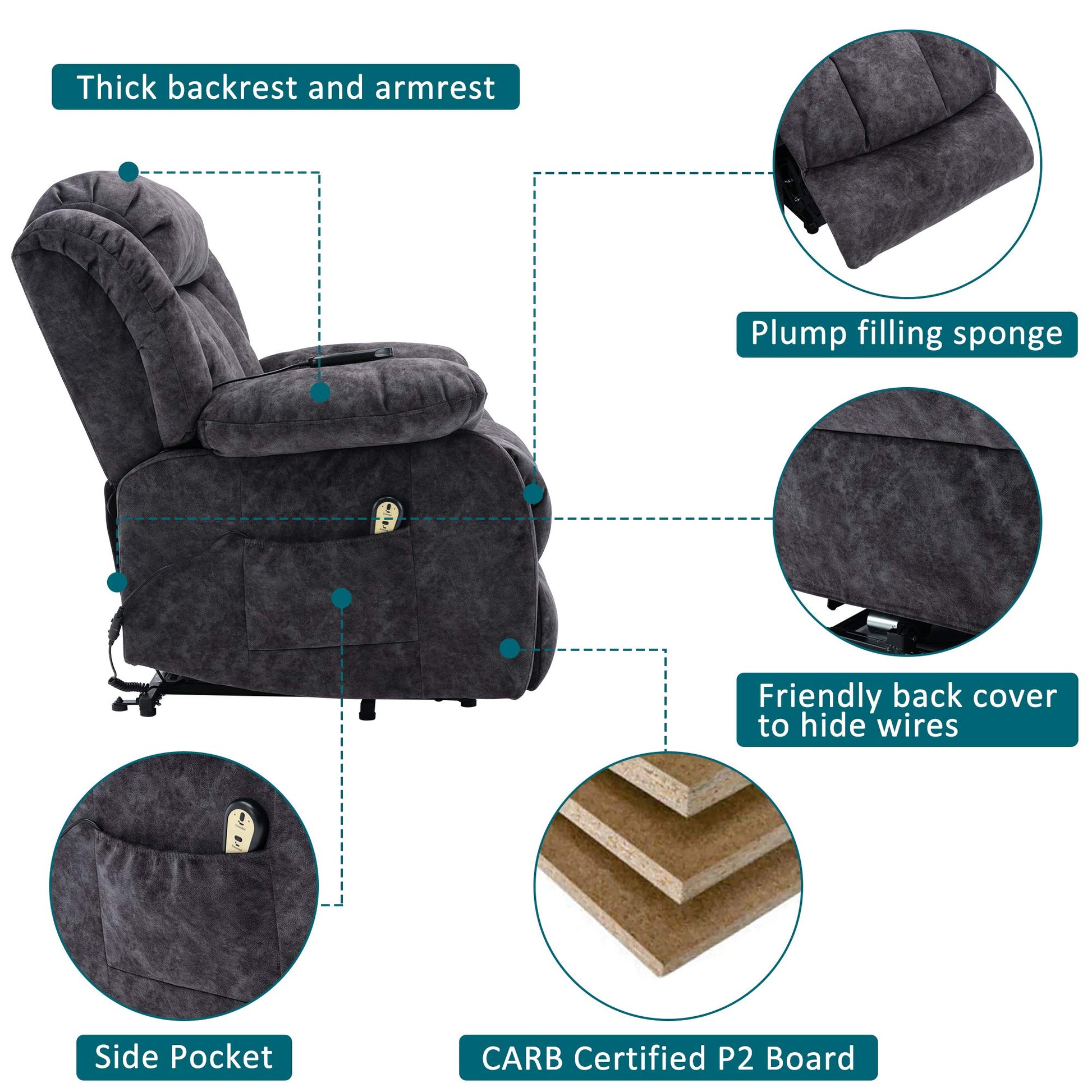 - STURDY AND FUNCTIONAL POWER LIFT RECLINER: Modern style and functionality merge together with single motor and heavy duty mechanism, lay back or lift and tilt to stand, smoothly adjust to any customized position which provide ultimate lounging experience.Plus, it comes with side pouch for magazines, books, and remotes, meaning once you're settled in, you won't have to worry about getting up to get a drink or turn the TV on.