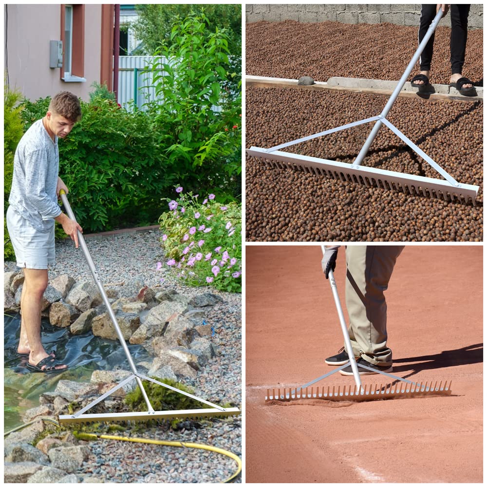 - Wide Application: This professional landscape rake is perfect for lawn care, spreading gravel or for grading soil. And the landscaping rake tool is also widely used to clean leaves & aquatic plants in lakes, pools, beaches.