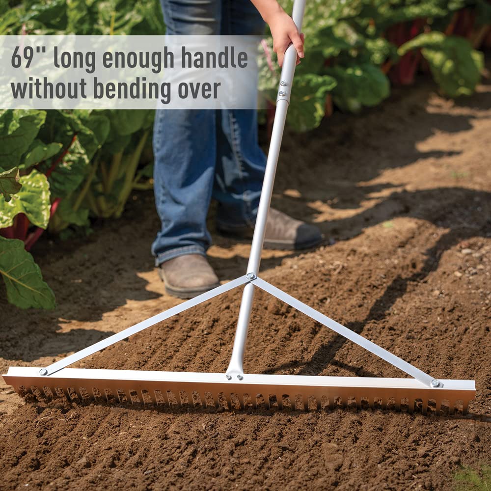 - 36" Wide Rake Head: 36" x 4" rake head of the aluminum rake is wide enough, with a 69" lightweight aluminum handle, it can complete landscaping work more quickly and efficiently.