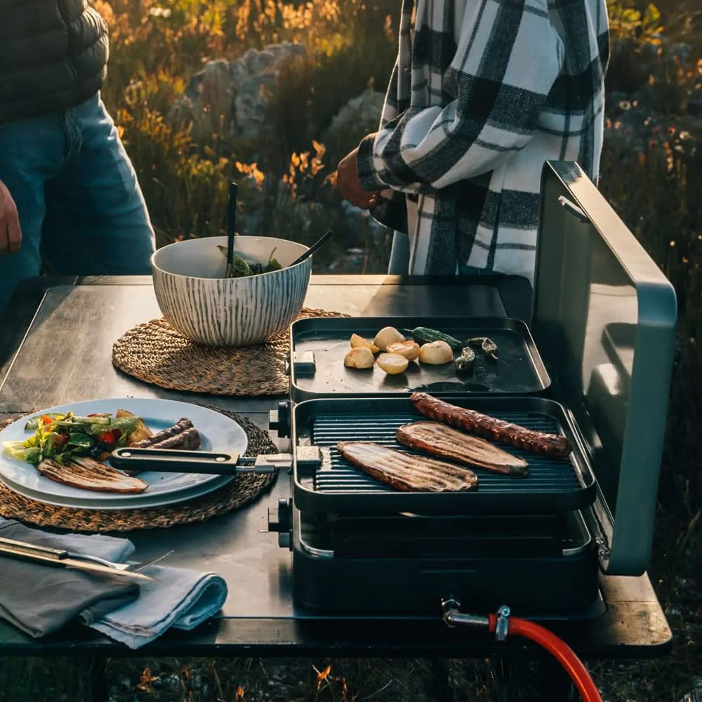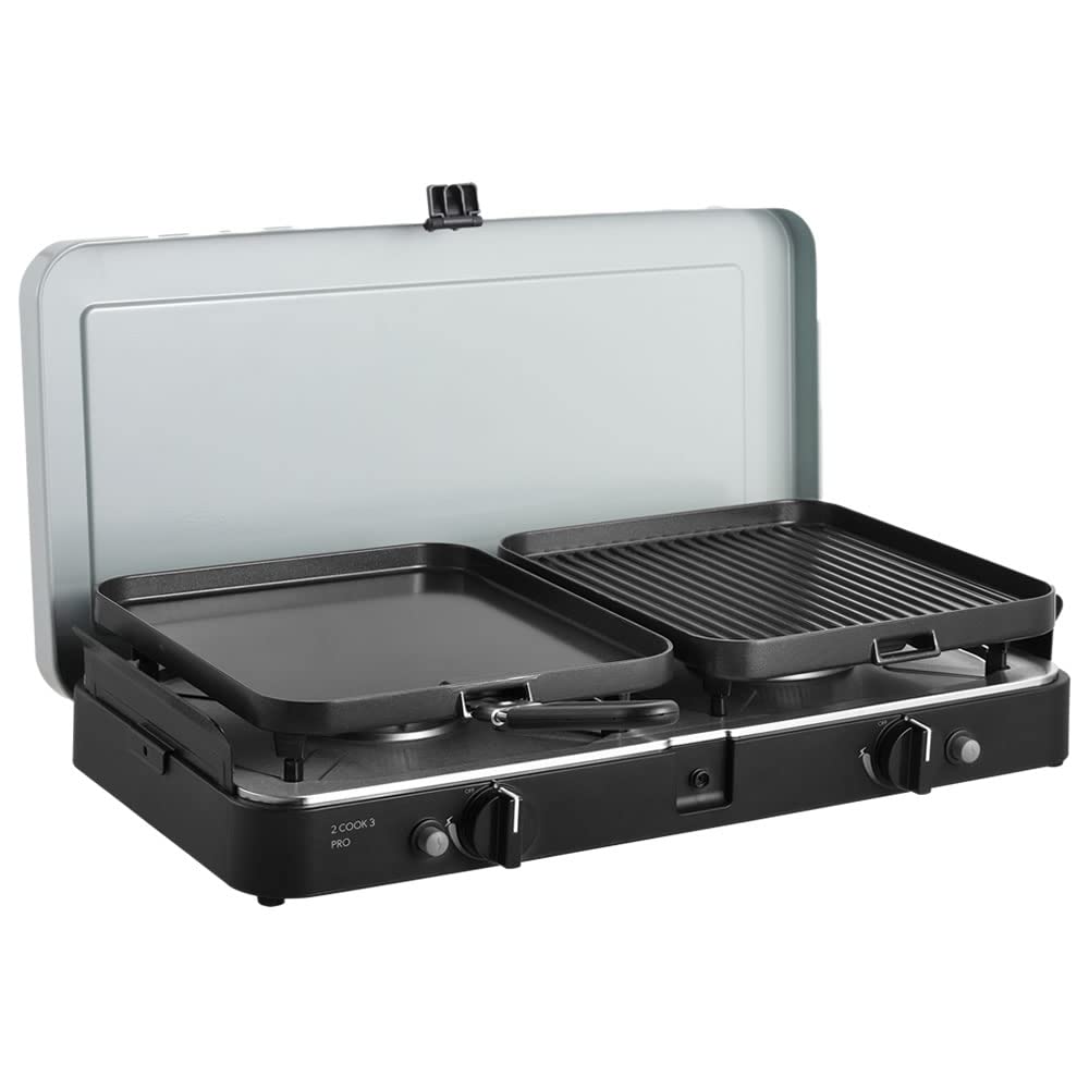 Details: One BBQ, multiple cooking variations. The possibility of discovery is endless with the 2 Cook 3 Pro Deluxe QR. With new features such as; gas ignition protection, bottom heat shield, dual windshields, coffee pot stand and a grill plate handle, the 2 Cook 3 Pro Deluxe barbecue is the ultimate camping companion, whether camping, caravanning or picnicking.