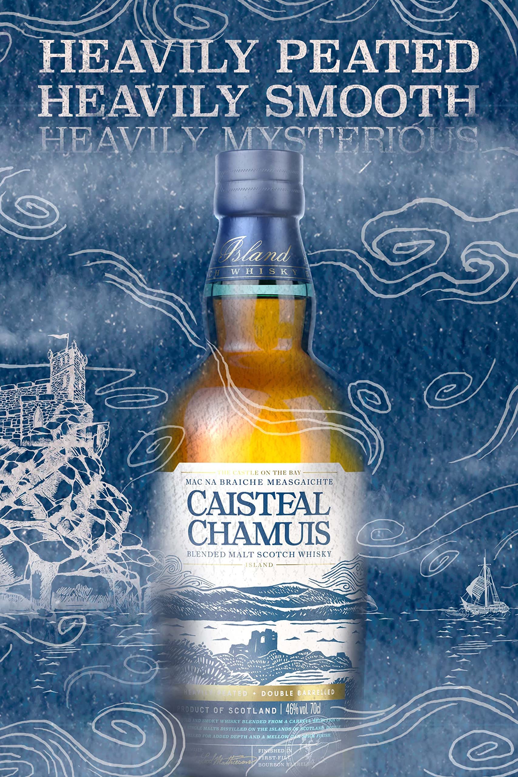 A classic ‘Island style’ Blended Malt Scotch Whisky, bold and smoky, but with an approachable double cask finish that balances the heavy Island peat notes, offering an easy access into the sometimes challenging world of peated whiskies. This is a characterful whisky, blended from a careful selection of fine Single Malts all distilled on the islands of Scotland and recasked in first-fill bourbon barrels for added depth and a mellow oakspice finish.