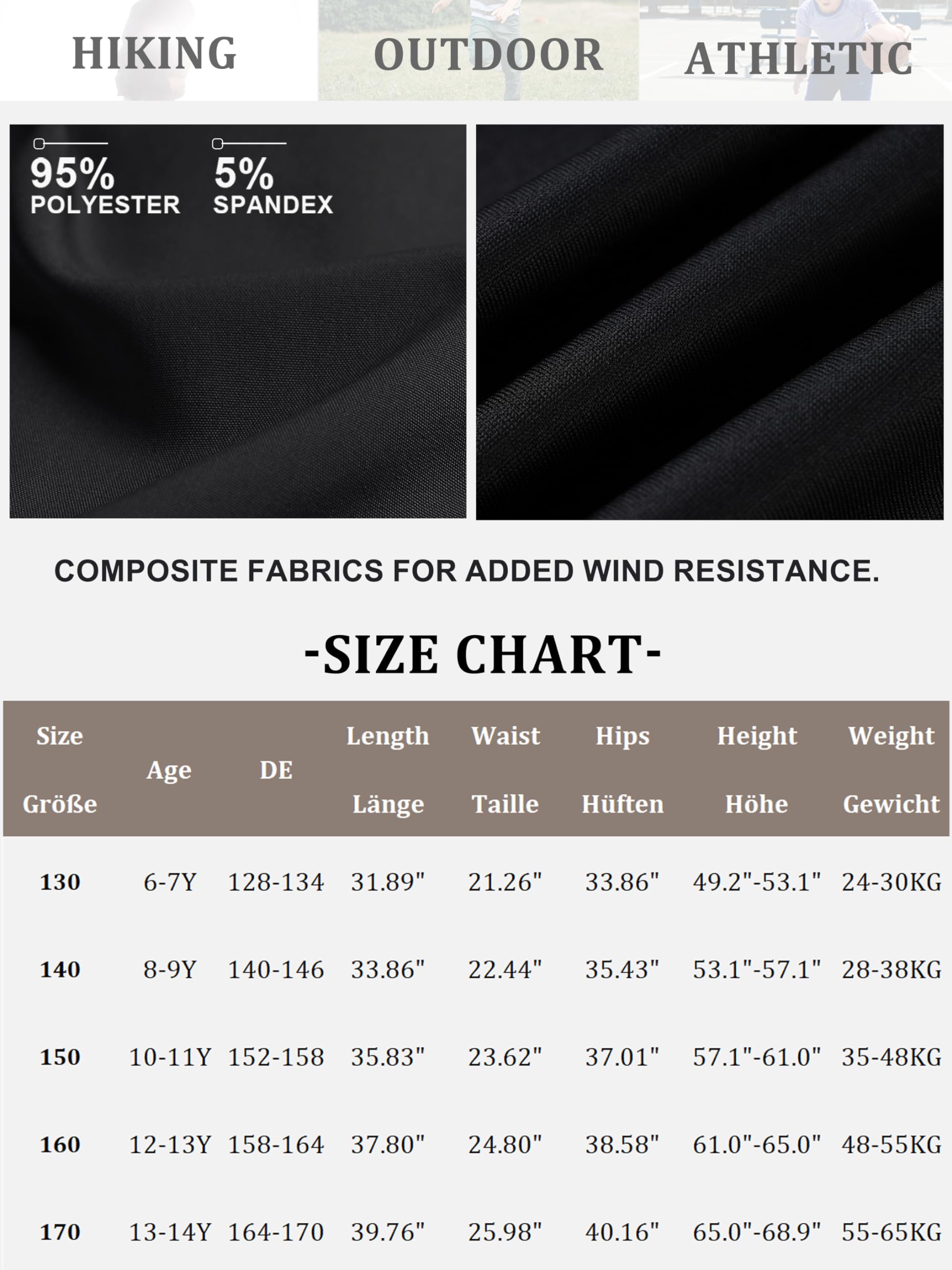 - Fabric: Kids Hiking Trousers are made of combination of polyester and spandex, composite fabric provide windproof.