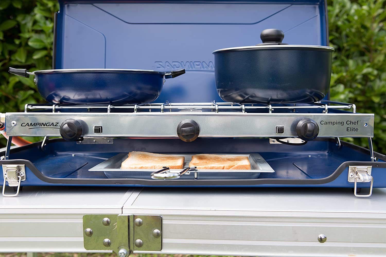 Campingaz Camping Chef Folding Compact Stove Ideal for camping holidays - this lightweight, compact and durable stove has plenty of power for frying and grilling. Easy to start and control with Piezo ignition and push-turn knobs, the chrome finish looks great and also makes cleaning a lot easier. The multi-functional stove is ideal for whipping up breakfast for the familiy on camping trips. Multi-functional – Cook full meals quickly and easily Two stainless steel burners (1.5 kW each), plus grill (1.5 kW) Compact - Folds away into a case when on the move Toast rack and drip tray with handle Piezo starter Runs off Campingaz R 904 or 907 size gas canisters Gas, regulator and hose sold separately Dimensions (open/closed): 60 x 40 x 35 / 59.5 x 32.5 x 8.5 cm Weight: 4.1 kg Manufacturer's Description About Campingaz Born from a love of camping and outdoor living, Campingaz products are trusted by generations of campers, a trust that has been earned by creating safe, reliable products that don’t fail to deliver, time and time again. Box Contains 1 x Campingaz Camping Chef Folding 2 burner stove See more