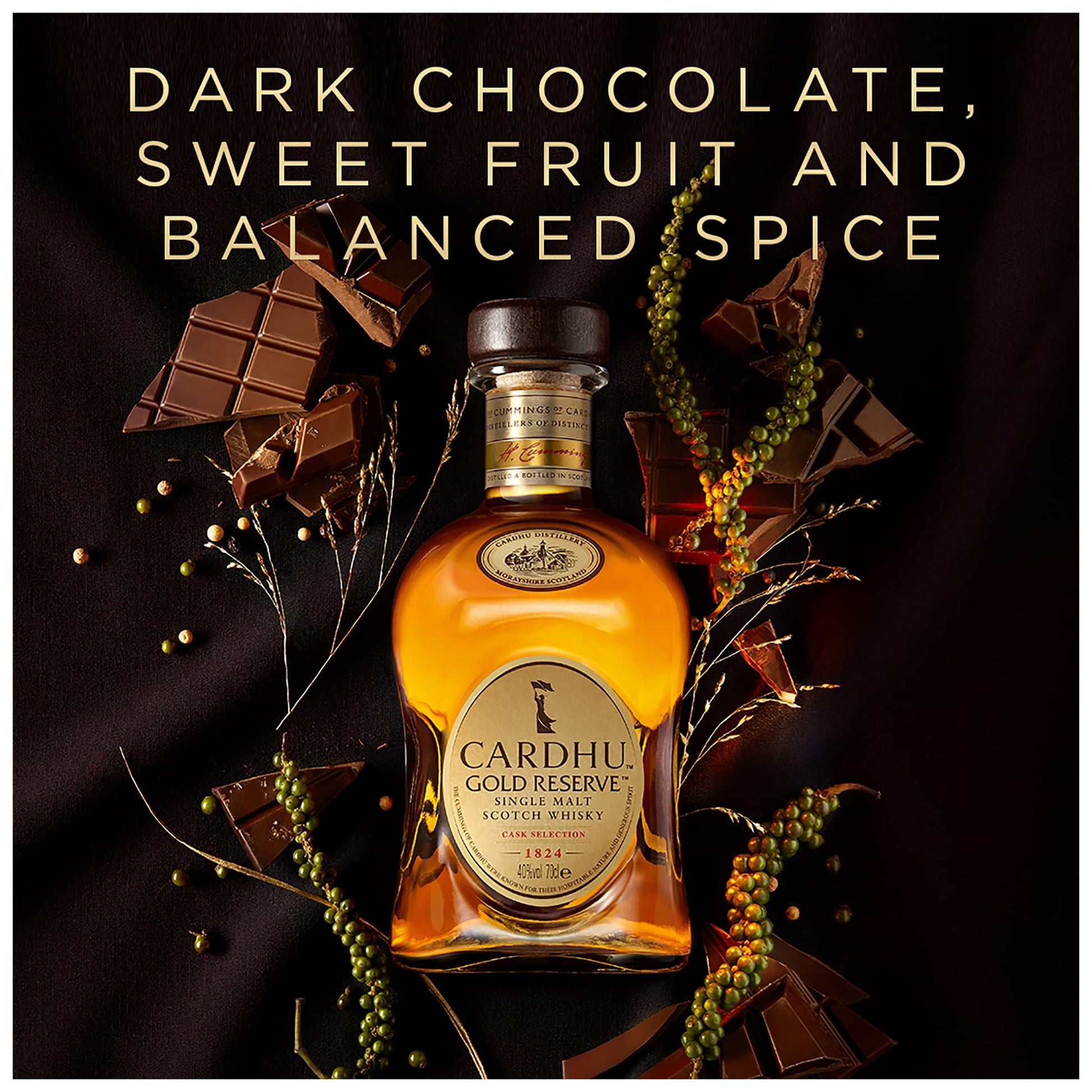 Cardhu comes from one of the oldest of the Speyside distilleries, which have nestled in foothills near the River Spey for 200 years. The Cardhu family of whiskies are intrinsically lively in character and produce a range of classic Speyside malts from the lush valley of the River Spey. With smooth, sweet, mellow characters, this whisky has warm notes of baked apple and toffee. IWSC Awards salute its distinct honey on the nose with some clean, firm grain followed by rich malt, exotic fruit with mango and kiwi, some grassiness, and light notes of peat in the background. Cardhu Gold Reserve Single Malt Scotch Whisky is perfect for toasting, celebrating, and sharing with friends old and new the way this whisky is served best, neat. Effortless and elegant, rich, smooth, and welcoming – allow yourself to be charmed by the characters from the distillery at Cardhu.