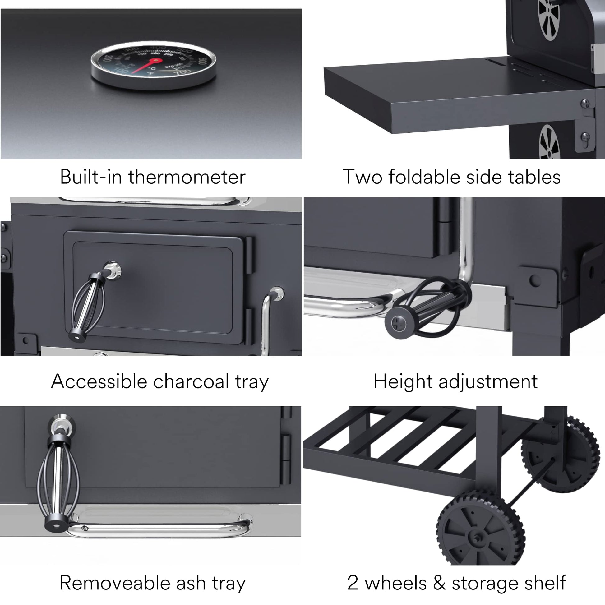 - EASY TO USE: Front access door to adjust or refill charcoal. Easy to clean removable ash tray. The external temperature gauge on the lid allows you safely to keep track of cooking temperatures. The built-in warming rack keeps food warm while you wait for the rest to cook.