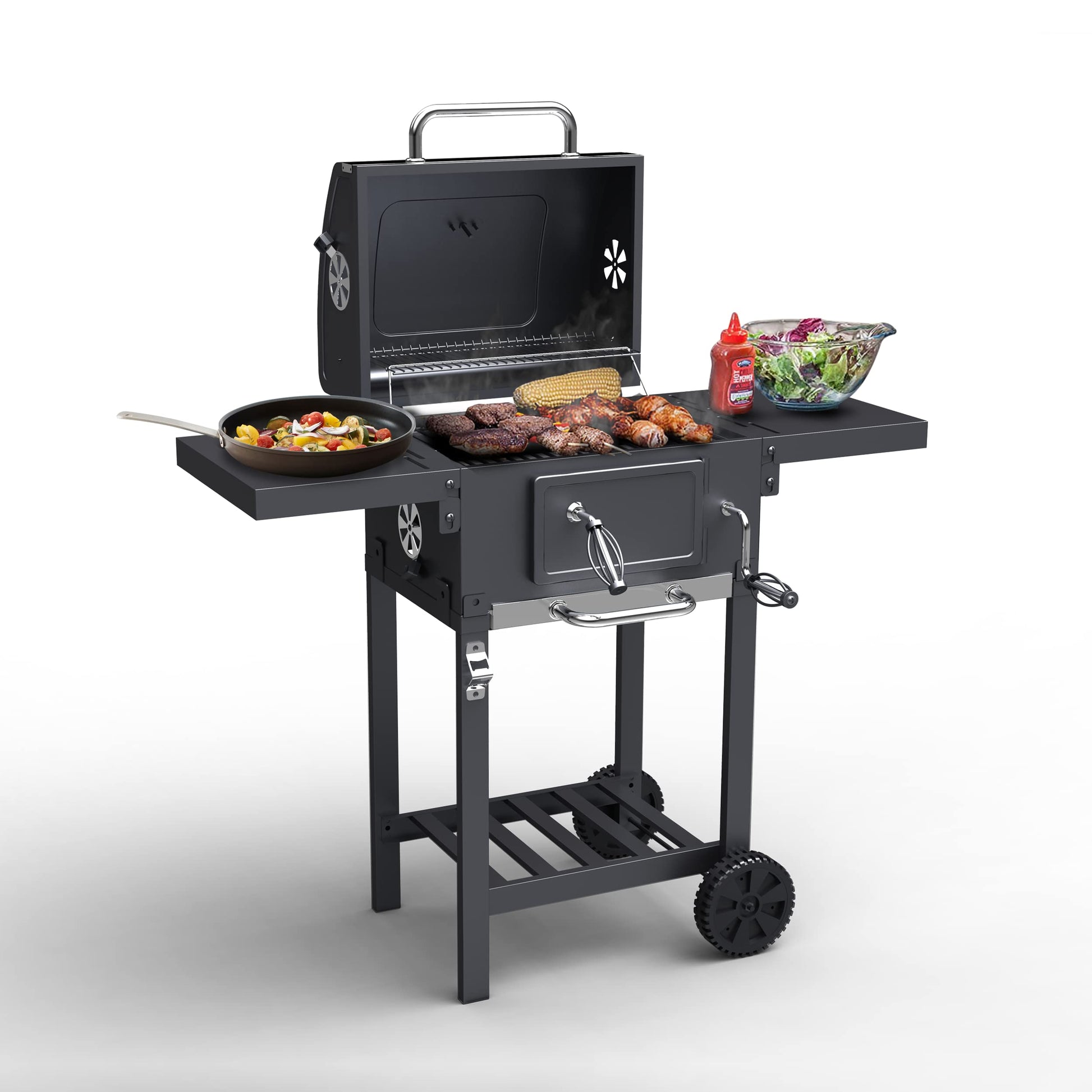 - ADDITIONAL FEATURES: The two foldable side table offers space to prep your food. A bottom shelf is a convenient place for you to keep your cooking utensils and accessories close by. Two wheels for easy transportation and mobility around the garden.