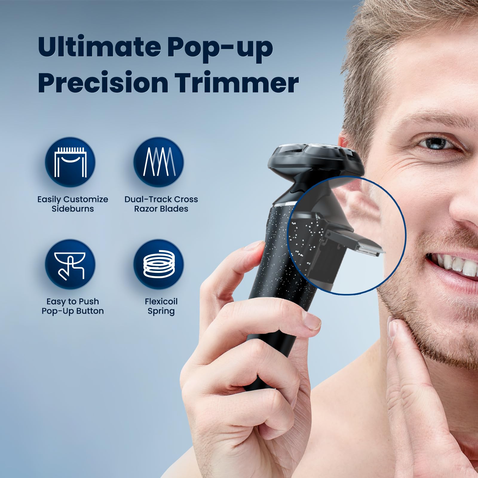 3D Floating Head & Pop-Up Beard Razor: The 3D floating head technology contours to the shape of your face, providing a more precise and comfortable shave. Plus, the pop-up beard trimmer offers a convenient way to shape and detail your facial hair.