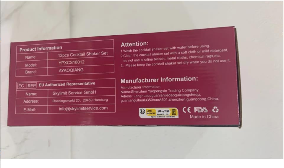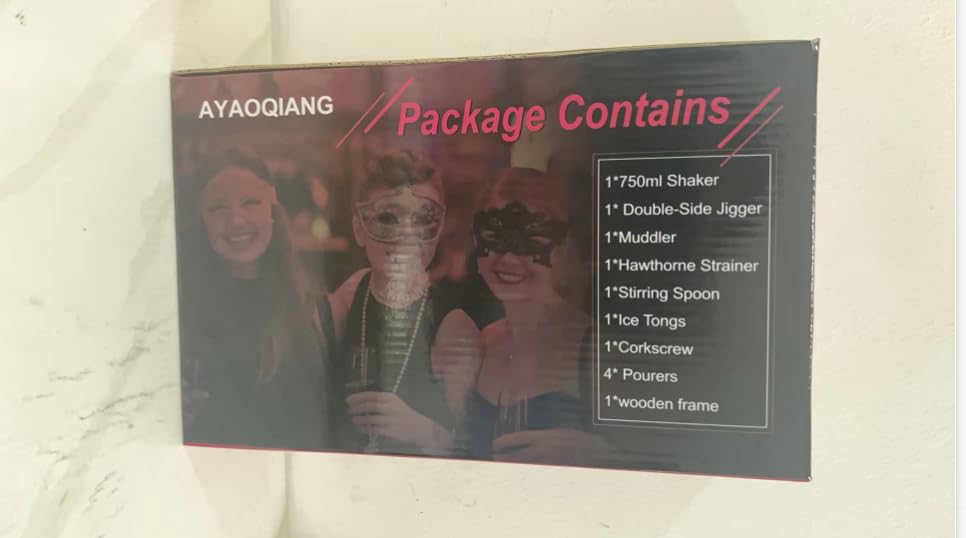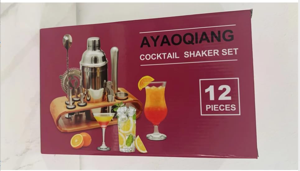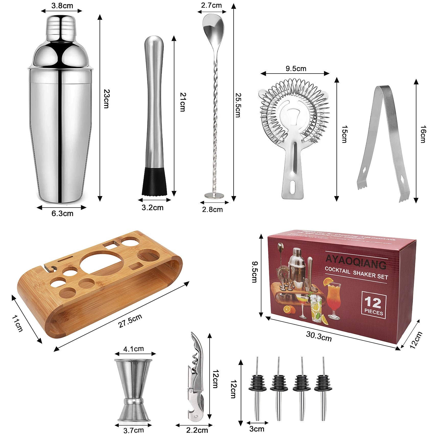 - ❤️12 Pcs Cocktail Set with Stand:Contains 1* 750ml cocktail shaker, 1*double-side jigger, 1* strainer, 1*pestle,1*corkscrew, 1* spoon, 4* pourers, 1* ice tongs, 1* bamboo stand. ( Pls contact us through seller service if there missing part or any other problem )