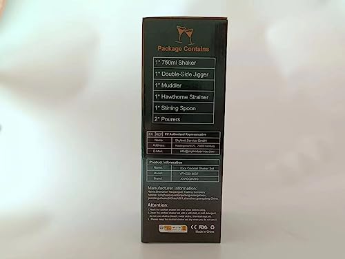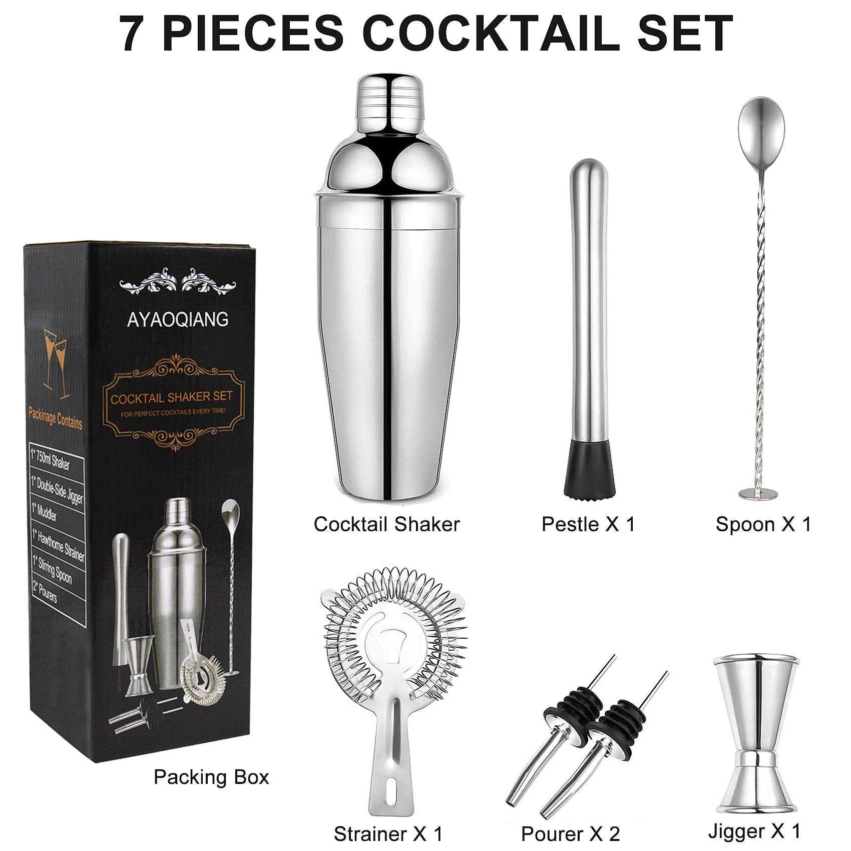 - đĽă7 Pcs Essential Cocktail Shaker Setă1x Cocktail Shaker 25OZ/750ml,1x Double Jigger 0.5oz&1oz/15ml&30ml,1x Strainer,1x Bar Spoon, 1xMuddler,2x Pour Spouts.This drink mixer set provides most essential bar accessories you need for mixing delicious cocktails.
