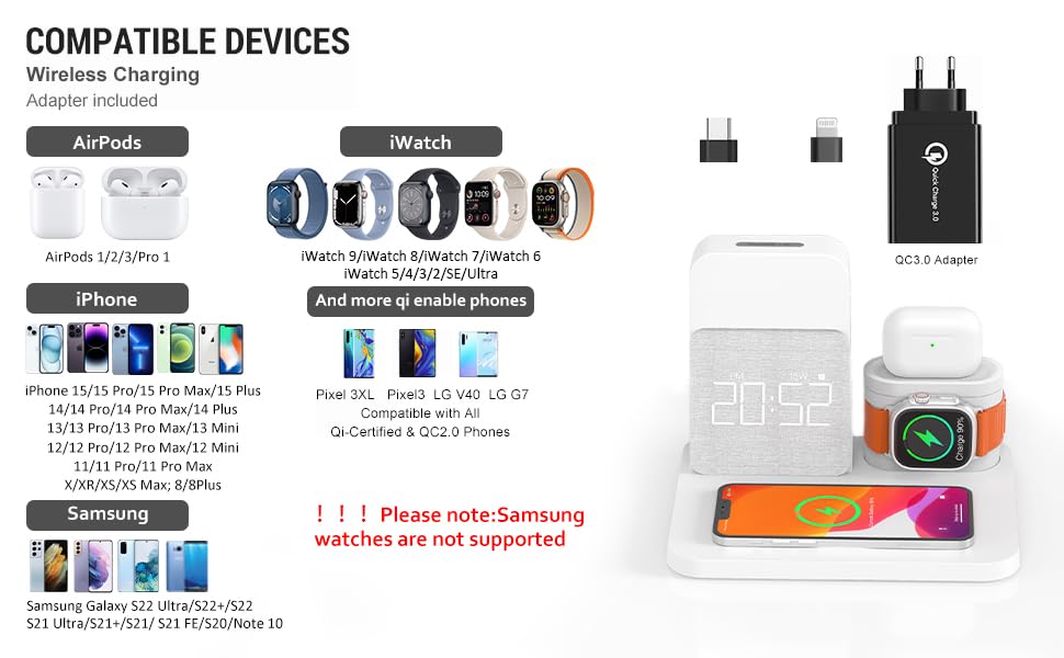 - ✅【Wired Compatible Charger】Experience lightning-fast 15W charging with our multi-function charger⚡. Compatible with iPhone 15/15 Pro/15 Pro Max/15 Plus/14/14 Pro/14 Pro Max/14 Plus/13/13 Pro/13 Pro Max/13 Mini/12/12 Pro/12 Pro Max/12 Mini / 11/11 Pro/11 Pro Max/X/XR/XS/XS Max/8/8Plus; Samsung Galaxy S22 Ultra/S22+/S22/S21 Ultra/S21+/S21/ S21 FE/S20/Note 10; AirPods 1/2 /3/Pro 1📱; Apple Watch 9/8/7/6/5/4/3/2/SE/Ultra⌚️(❗❗❗Please note: only supports Apple Watch)