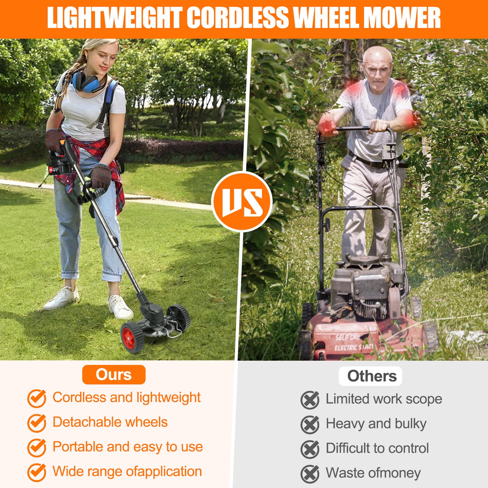 - Light Weight & Easy To Us: Garden strimmer cordless weight is only 3.96 pounds but sturdy,even the elderly or women can easily control and use it, with removable wheels, weeding is as easy as walking,mproving work efficiency, saving time and effort. The length can be adjusted to meet the needs of most people's garden pruning work.