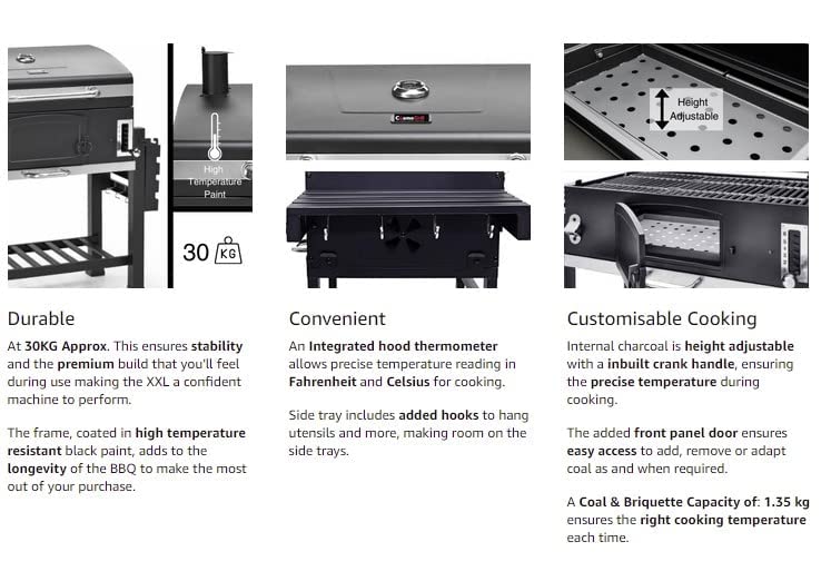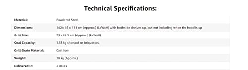 Details: The CosmoGrill XXL Charcoal Smoker Barbecue is the perfect outdoor companion for those intimate long weekends or family filled summer parties. Featuring a generously sized grilling area, there’s plenty of space to have over 15 burger patties and 15 sausages cooking at a time, as well as grilling or smoking whole baby chickens, wings, steaks, fish, brisket and much more. The height-adjustable coal tray enables better control over how much heat is distributed to accommodate specific cooking requirements for fish, meat and vegetables. The XXL Smoker is topped with cast iron grills, evenly distributing heat, so once it’s hot, it stays hot, eliminating the need to constantly rotate the meat! What’s more enticing is how simple it is to clean the barbecue after a day of grilling, the coal tray and grill are easily removable and the barbecue itself requires a quick wipe down. Technical features:Material: Powdered steelProduct Dimensions: 142 x 46 x 111 cm approx (LxWxH) with both side shelves up, but not including when the hood is upGrill Size: 73 x 42.5 cm approx (LxWxH)Coal Capacity: 2.7 kg Charcoal Briquettes or 1.35 kg coalCoal Grill grate material: Cast ironWeight: 30kg approxNumber of boxes barbecue is delivered in: 2 Item arrives flat pack and will require assembly.Assembly is easy and can be done by two people within 2 hours if the full instruction manual is followed. The 2 boxes may arrive at different times but within the delivery time stated on Amazon. All boxes are shipped together. In the unlikely event that you encounter issues with your barbecue upon delivery, please contact us immediately. In most cases, we can remediate any issues without the need to return the barbecue. If you do not intend to keep your order, please do not assemble or use it.