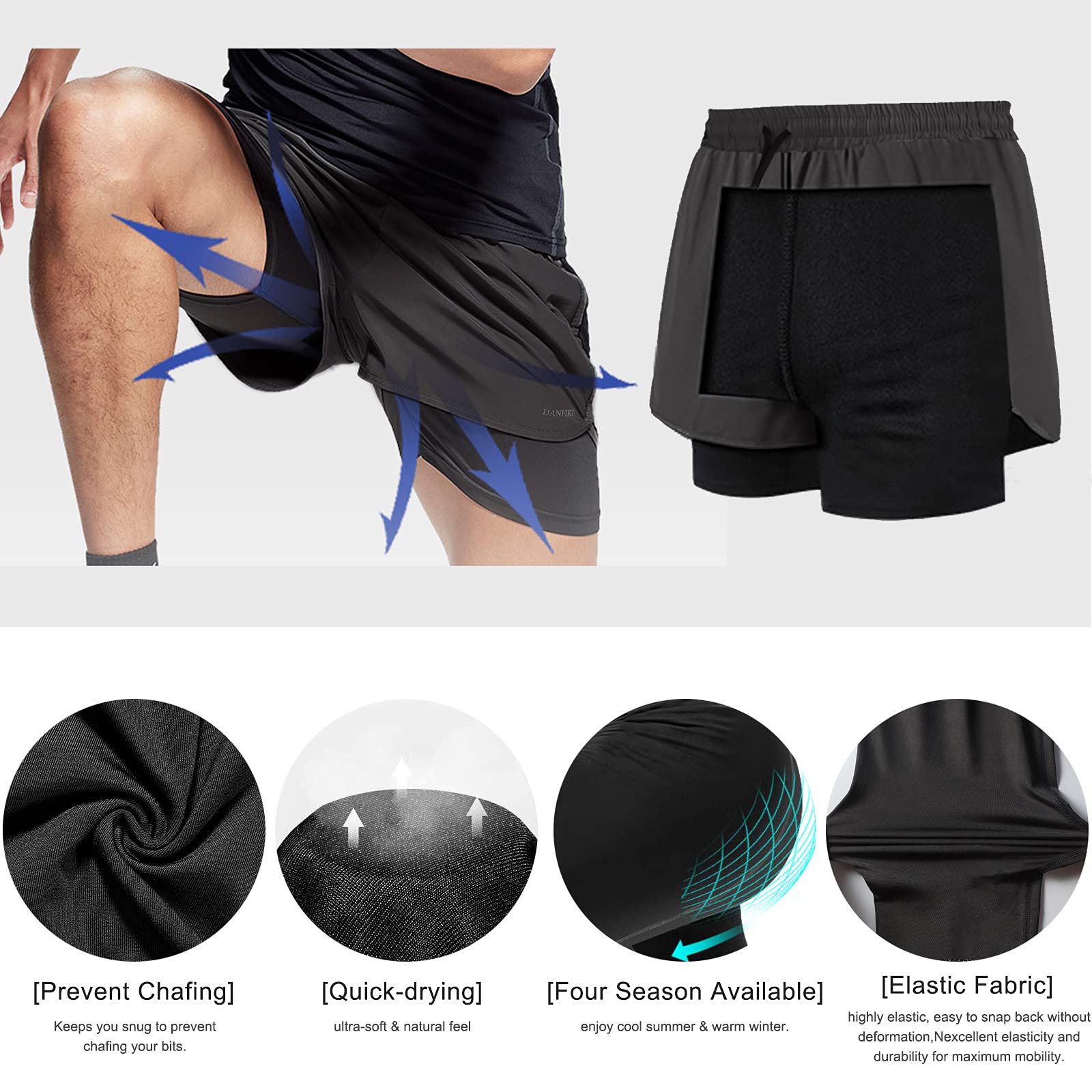 - 【Men's Shorts】Men Running Shorts made of 95% Polyester, 5% Elastane. 2 in 1 Gym workout shorts are made of Updated skin-friendly, lightweight and stable stretch material that can be maximally moved,the lining is much compres than others.