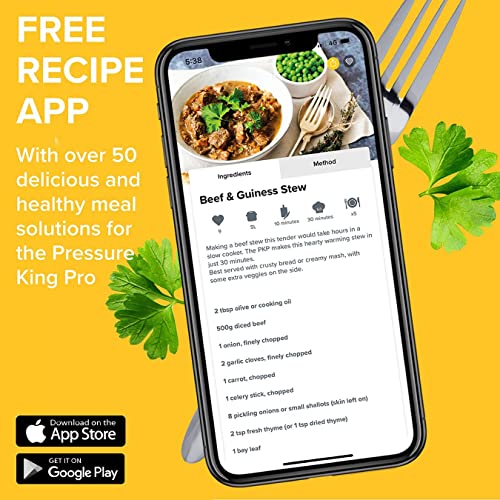 Space-Saving Design: With compact dimensions of 32.6 x 31 x 32.6 cm, this pressure cooker fits easily into any kitchen, no matter the size. It also comes with a bonus steamer tray and access to a free recipe app with over 50 recipes.