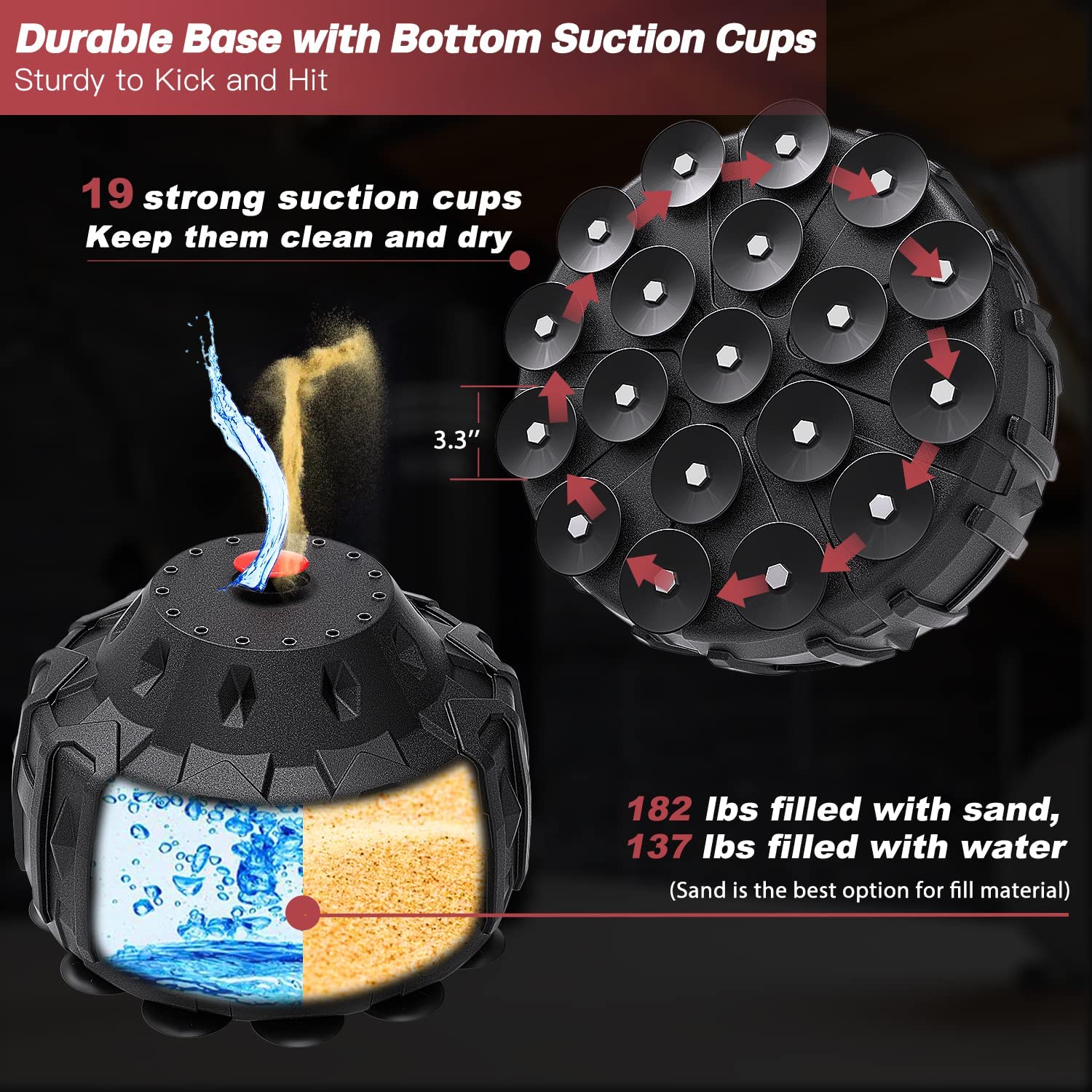 New-Design Base with 19 Suction Cups: The sturdy base is approximately 12 inches high and can be filled with sand (182lbs) or water (137lbs). The 19 suction cups enhance stability, ensuring the bag stays in place during your toughest workouts. For best results, fill with sand and ensure suction cups are on clean, dry surfaces.