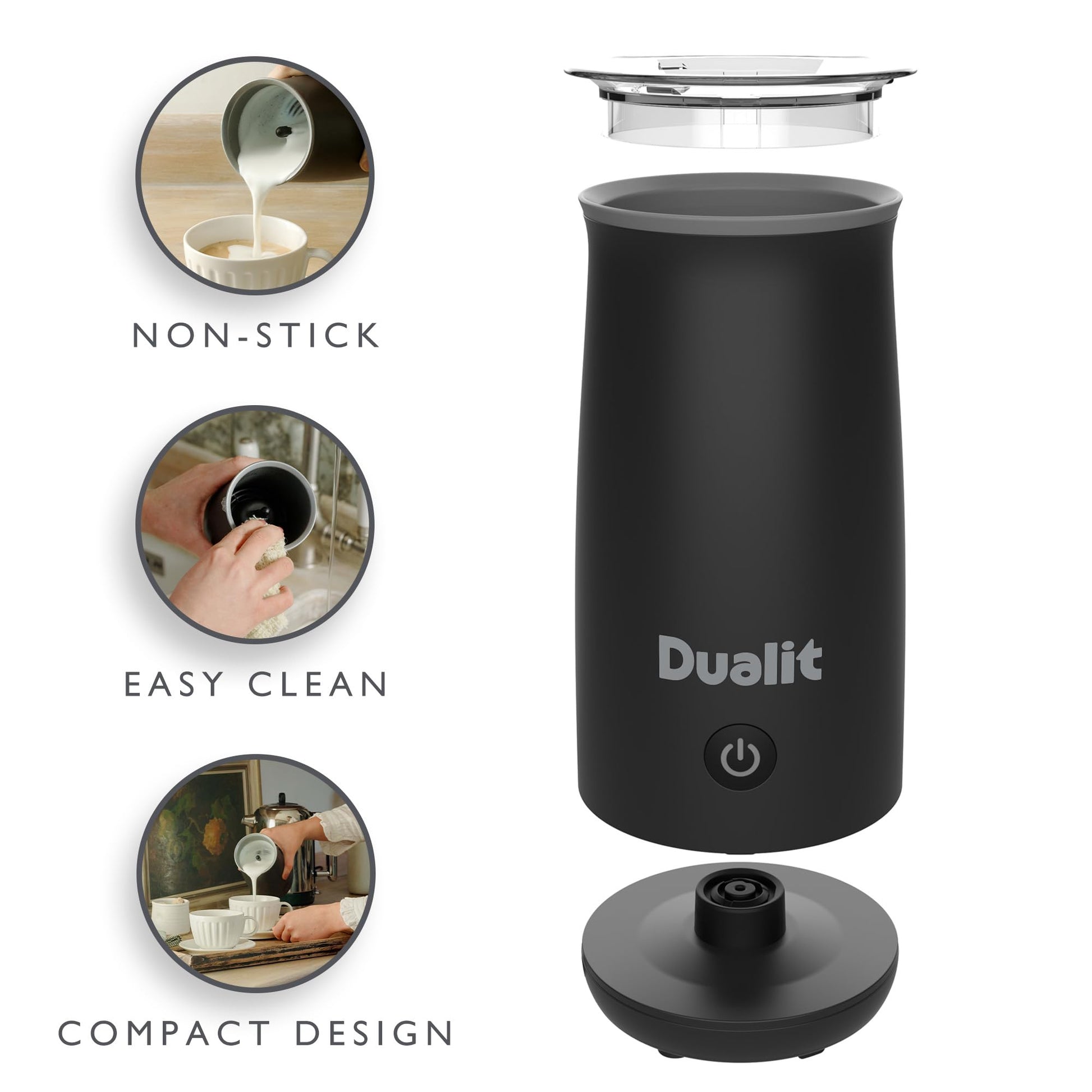 - Dualit Handheld Milk Frother | One Touch Operation | Removable Whisk for Easy Cleaning | Cordless | Non-Stick | 340 ml Black -