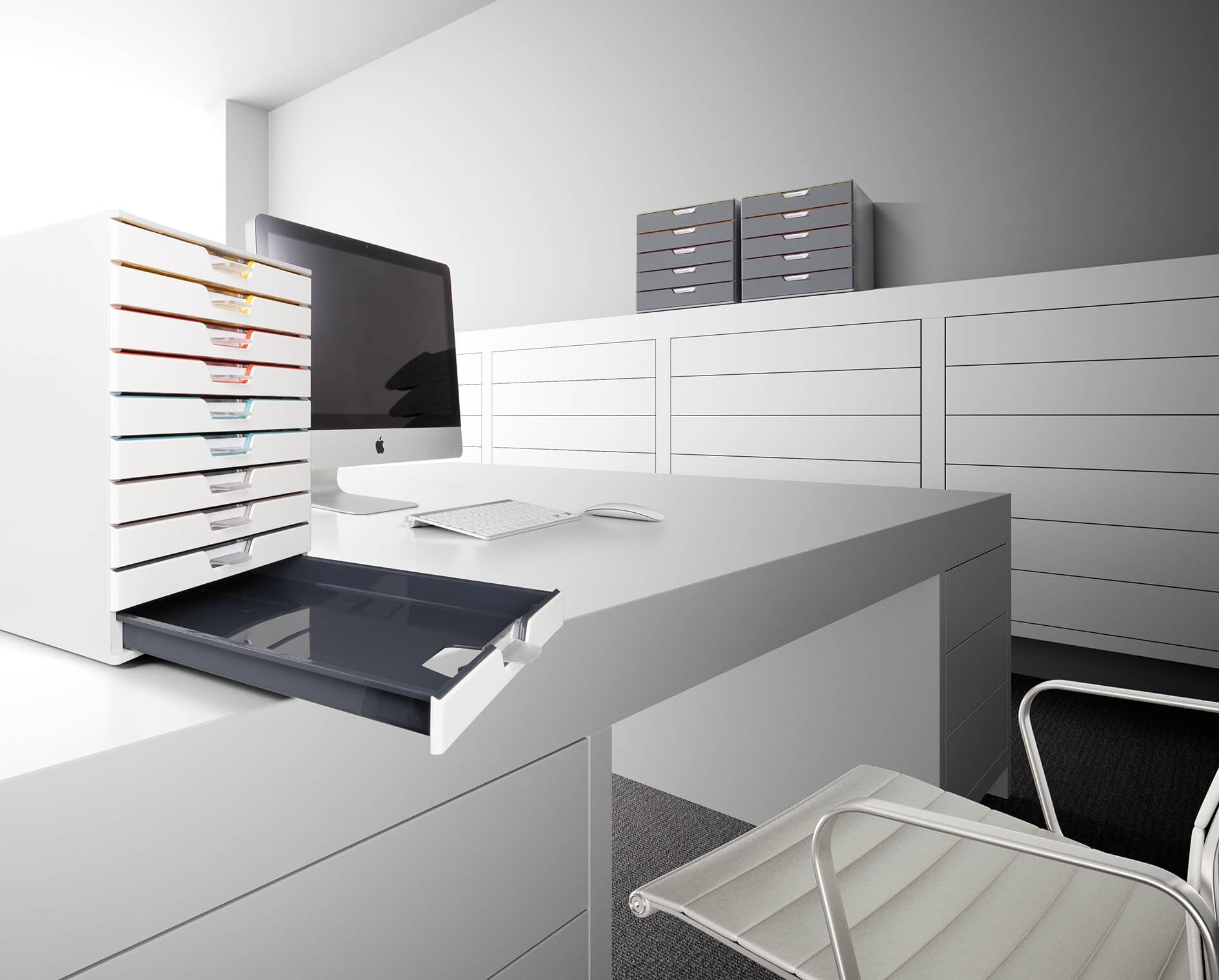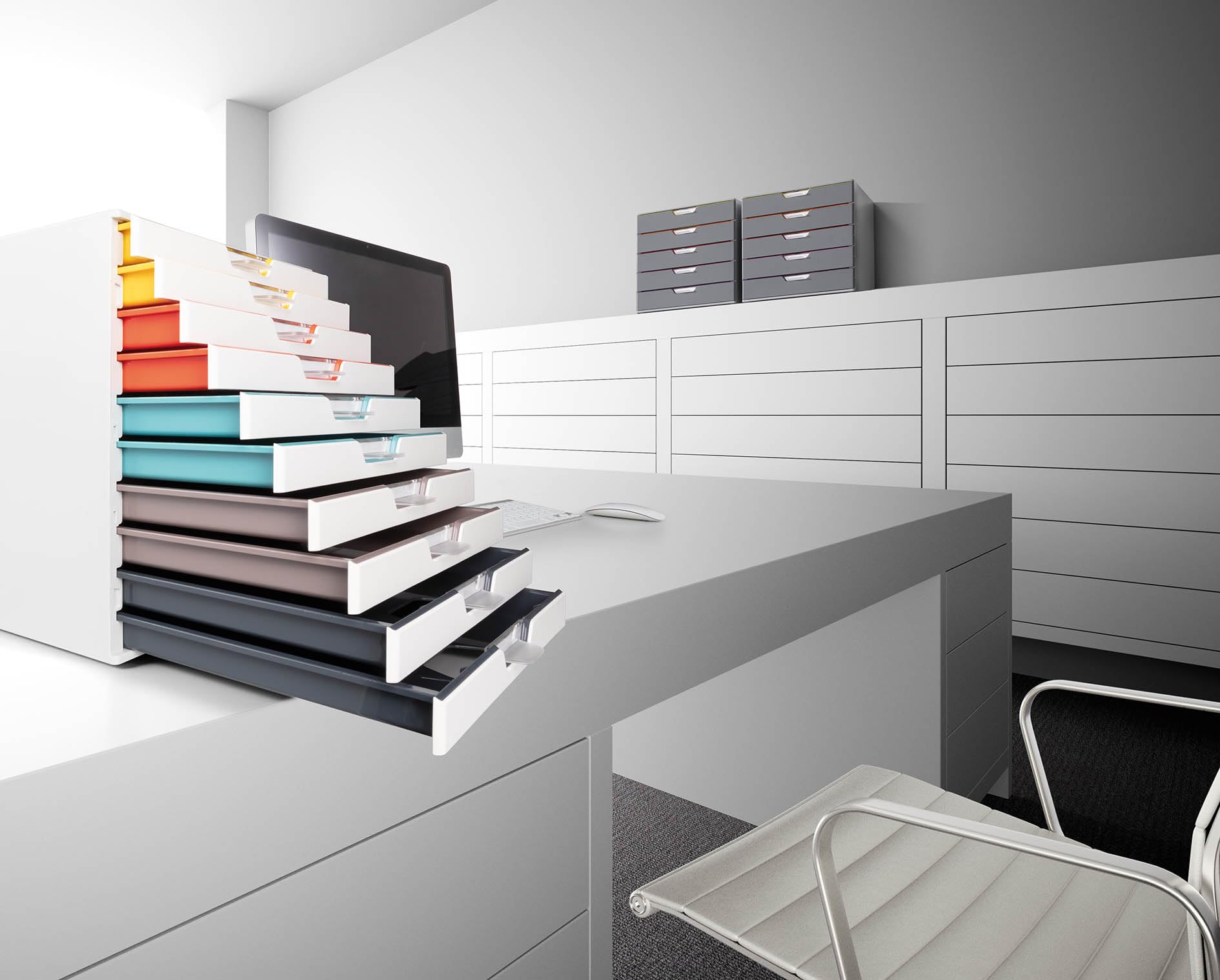 Drawer Configuration: 2x Light Yellow, 2x Red Orange, 2x Blue Green, 2x Platinum Grey, 2x Grey Blue