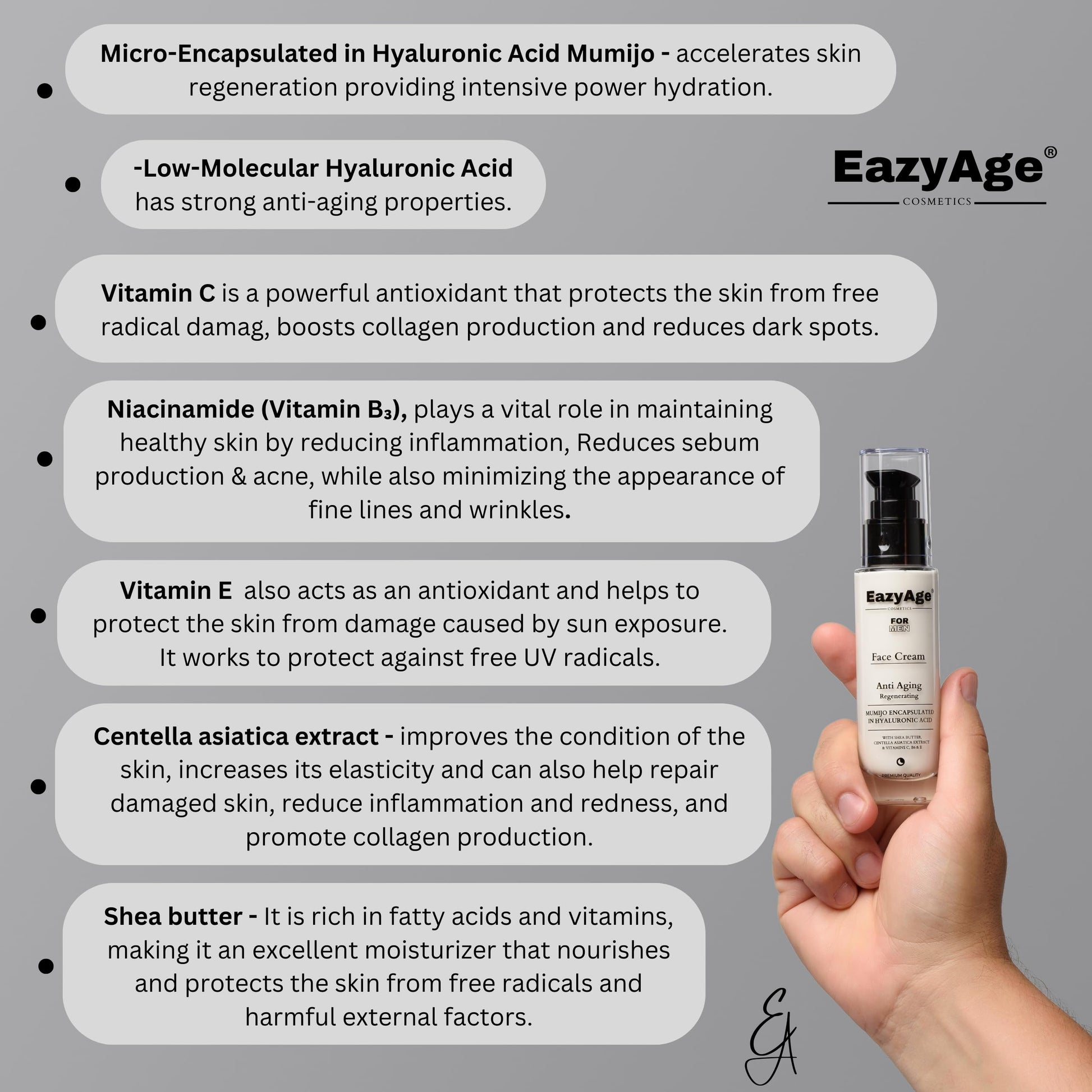 - EazyAge | Anti-Aging Face Cream for Men | Night Skin Regeneration | Men's Moisturiser | Mumijo Shilajit, Hyaluronic Acid | Reduces Wrinkles, Dark spots, Redness, 50ml -