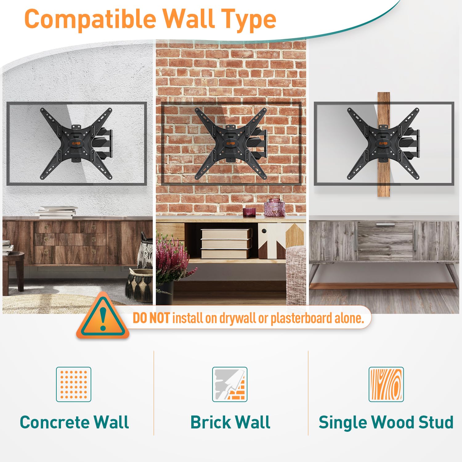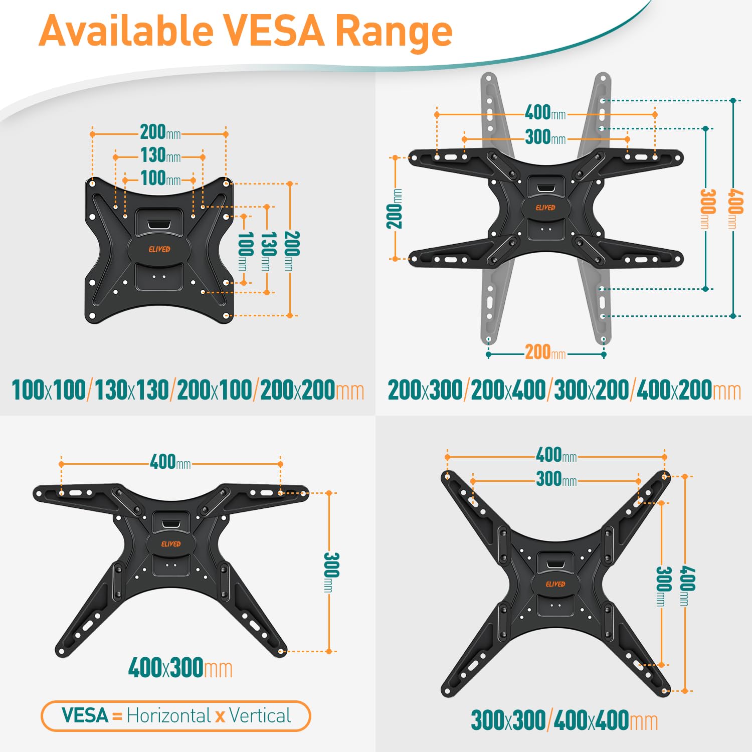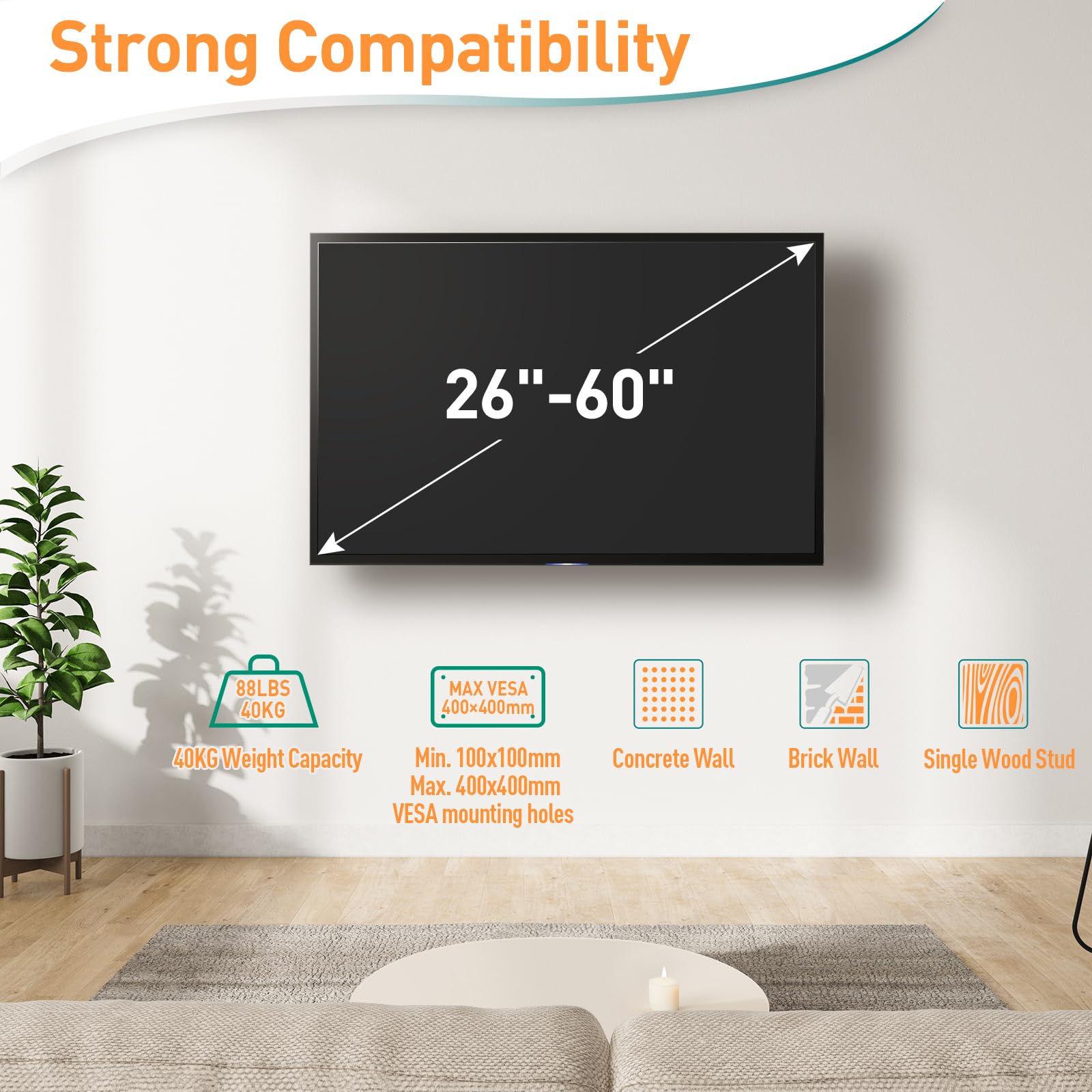 Universal Compatibility: This TV mount fits most 26"-60" TVs with VESA patterns from 100x100mm to 400x400mm and can support up to 40KG. It's compatible with major TV brands like Samsung, LG, Sony, and more, ensuring a secure fit for a wide range of setups.