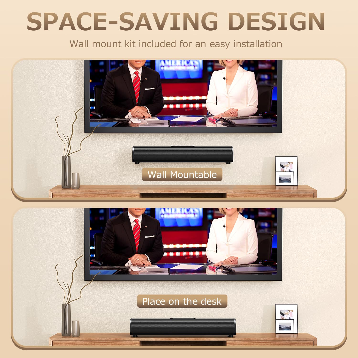 Sleek and Space-Saving Design: Measuring just 16 inches, this compact soundbar is perfect for smaller spaces. Its sleek, modern design complements any room, whether mounted on the wall or placed on a desktop, ensuring you get great sound without taking up too much space.