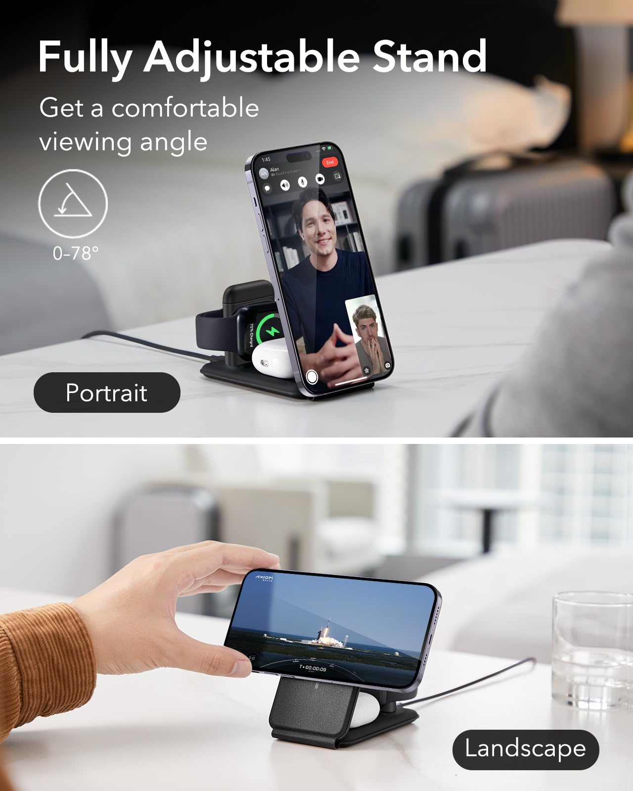 Adjustable 2-Way Stand: Supports both portrait and landscape modes—ideal for FaceTime, Netflix, or checking emails while charging.