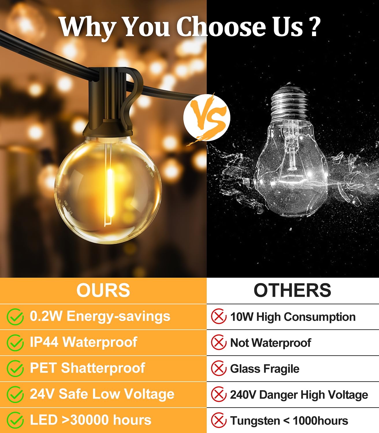 24V Safe Low Voltage & Energy Saving: The string lights are powered by a low voltage 24V plug, making them safe to touch and energy efficient. They save over 90% energy compared to traditional incandescent bulbs, with a long lifespan of over 30,000 hours.
