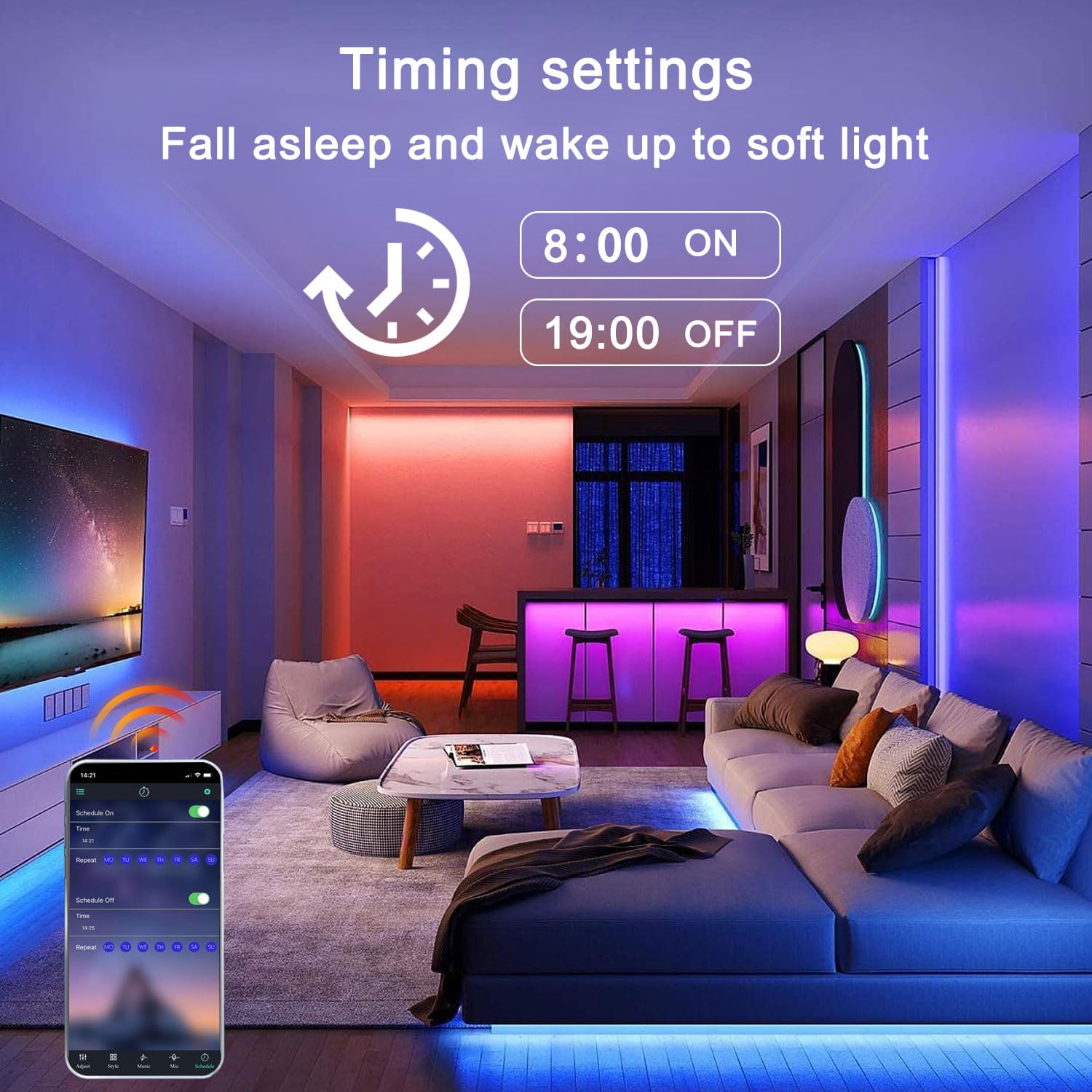 Timer and Control Distance: Set a timer for the lights to automatically turn on/off and control them remotely from up to 50ft away using the app.