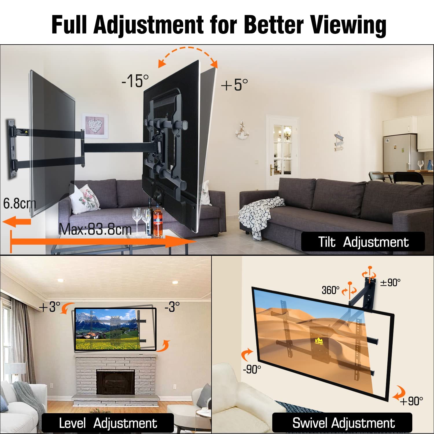 90-Degree Corner Mounting: With 90 degrees of swivel and an extension of nearly 83.8cm from the wall, this mount offers optimal corner placement and viewing angles.