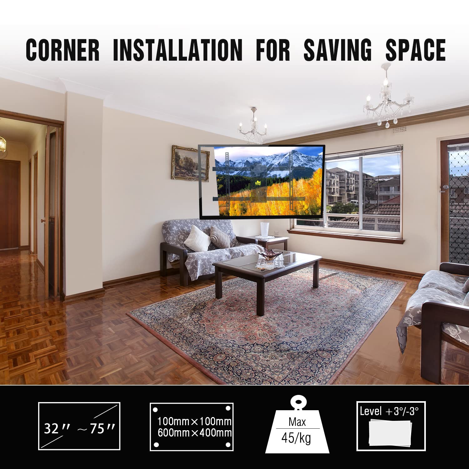 - FORGING MOUNT Long Reach TV Wall Bracket Corner TV Bracket Wall Mount for 32"-75" TVs 84cm of Smooth Extension Plus Swivel Tilt Full Motion Adjustable TV Mounting Bracket holds 45kg Max VESA 600X400mm -